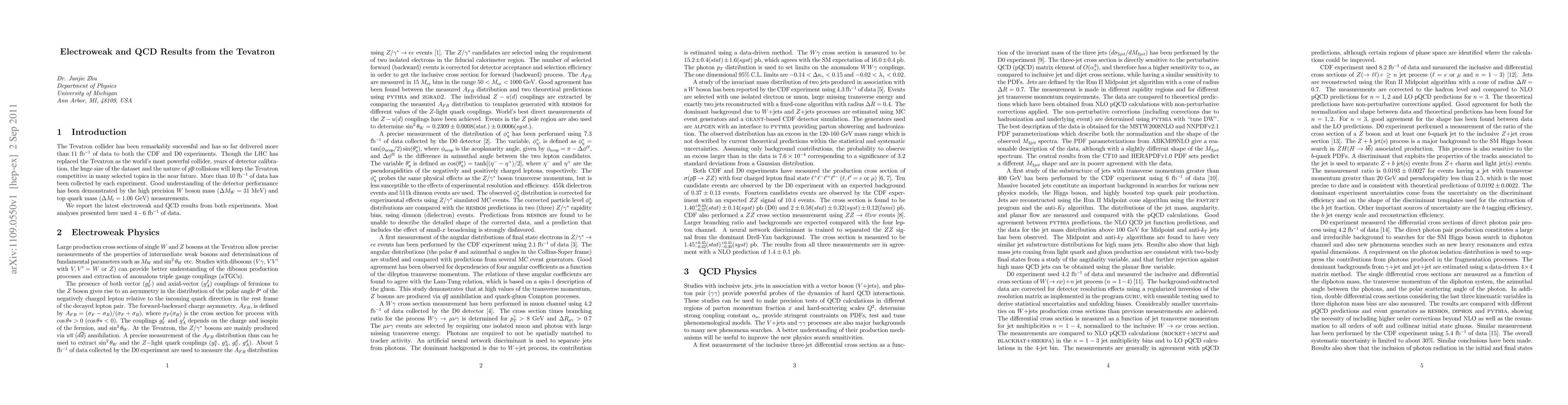 Summary: This paper presents the most recent findings on electroweak and Quantum Chromodynamics (QCD) from two major experiments conducted at the Tevatron particle collider, contributing to our understanding of fundamental particle interactions.