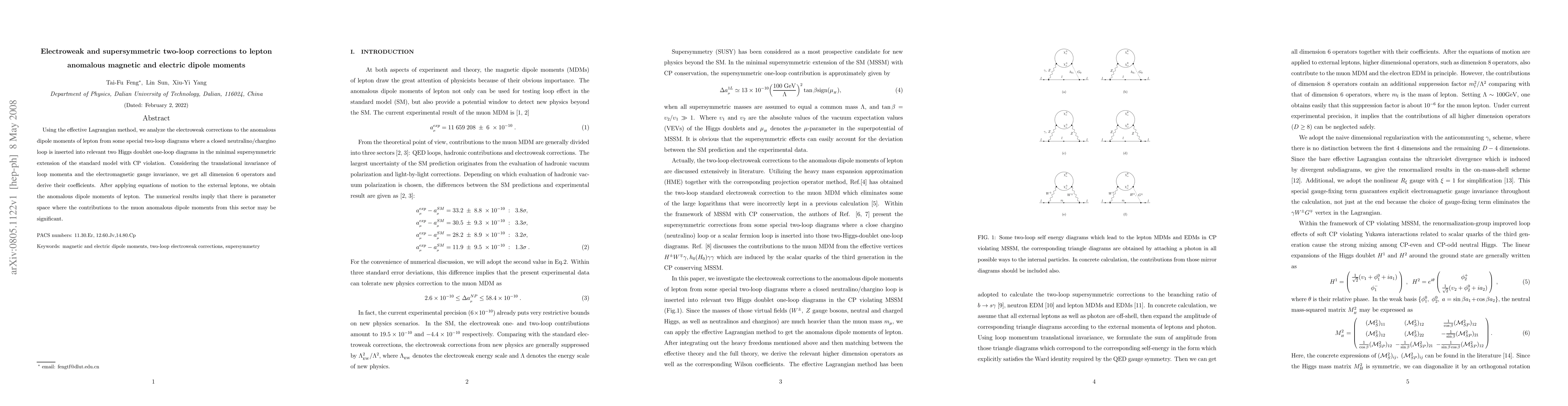 This paper investigates electroweak and supersymmetric two-loop corrections to lepton anomalous magnetic and electric dipole moments using the effective Lagrangian method. It finds significant contributions to the muon anomalous dipole moments from special two-loop diagrams involving neutralino/chargino loops in the minimal supersymmetric extension of the standard model.