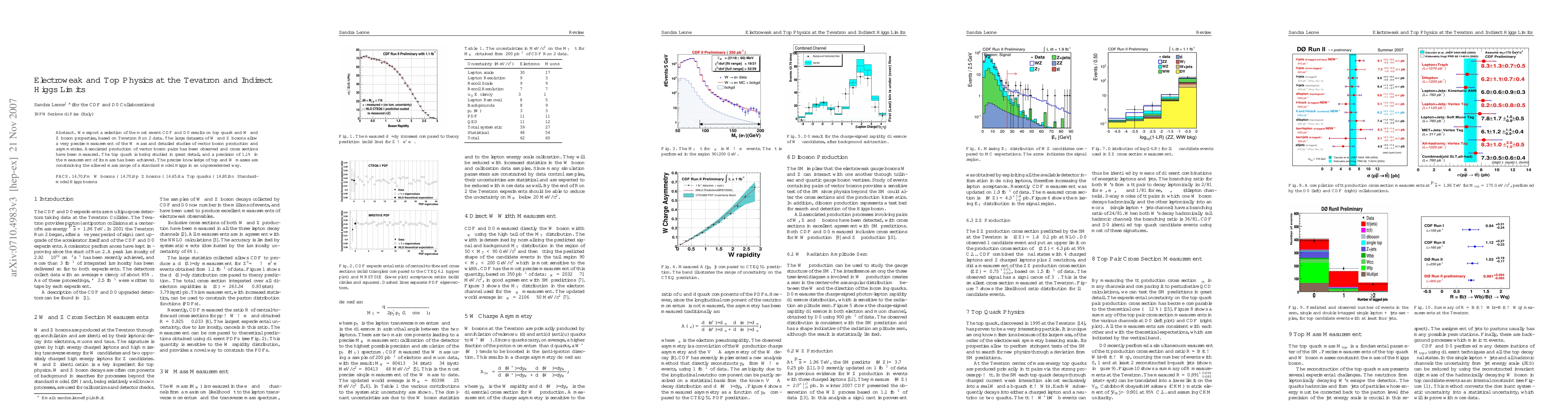 We report a selection of the most recent CDF and D0 results on top quark and W and Z boson properties, based on Tevatron Run 2 data. The large datasets of W and Z bosons allow a very precise measurement of the W mass and detailed studies of vector boson production and asymmetries. Associated production of vector boson pairs has been observed and cross sections have been measured. The top quark is being studied in great detail, and a precision of 1.1 % in the measurement of its mass has been achieved. The precise knowledge of top and W masses are constraining the allowed mass range of a standard model Higgs in an unprecedented way.