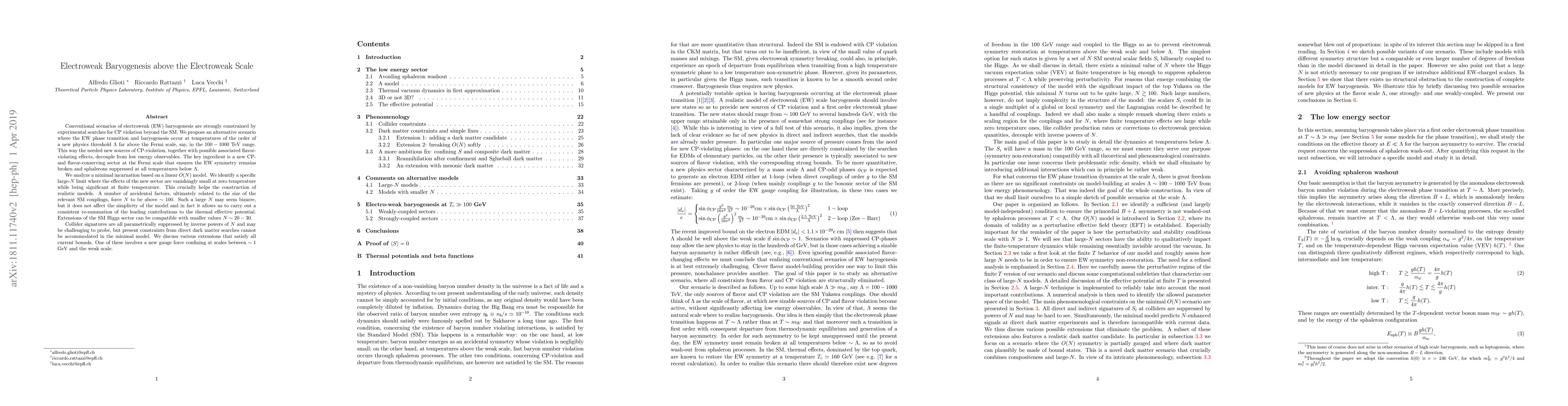 Conventional scenarios of electroweak (EW) baryogenesis are strongly constrained by experimental searches for CP violation beyond the SM. We propose an alternative scenario where the EW phase transition and baryogenesis occur at temperatures of the order of a new physics threshold $\Lambda$ far above the Fermi scale, say, in the $100-1000$ TeV range. This way the needed new sources of CP-violation, together with possible associated flavor-violating effects, decouple from low energy observables. The key ingredient is a new CP- and flavor-conserving sector at the Fermi scale that ensures the EW symmetry remains broken and sphalerons suppressed at all temperatures below $\Lambda$. We analyze a minimal incarnation based on a linear $O(N)$ model. We identify a specific large-$N$ limit where the effects of the new sector are vanishingly small at zero temperature while being significant at finite temperature. This crucially helps the construction of realistic models. A number of accidental factors, ultimately related to the size of the relevant SM couplings, force $N$ to be above $\sim 100$. Such a large $N$ may seem bizarre, but it does affect the simplicity of the model and in fact it allows us to carry out a consistent re-summation of the leading contributions to the thermal effective potential. Extensions of the SM Higgs sector can be compatible with smaller values $N\sim 20-30$. Collider signatures are all parametrically suppressed by inverse powers of $N$ and may be challenging to probe, but present constraints from direct dark matter searches cannot be accommodated in the minimal model. We discuss various extensions that satisfy all current bounds. One of these involves a new gauge force confining at scales between $\sim1$ GeV and the weak scale.
