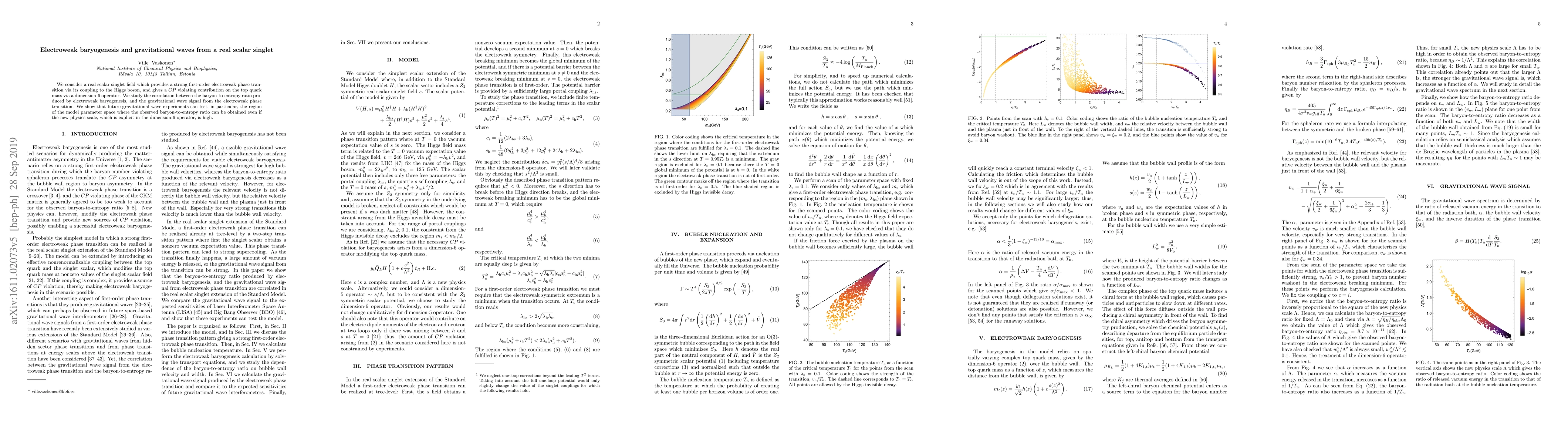 This paper explores a real scalar singlet field that induces a strong first-order electroweak phase transition and contributes to $CP$ violation in the top quark mass. It investigates the correlation between electroweak baryogenesis and gravitational waves from this phase transition, suggesting that future gravitational wave experiments could test parameter regions where high new physics scales still yield the observed baryon-to-entropy ratio.