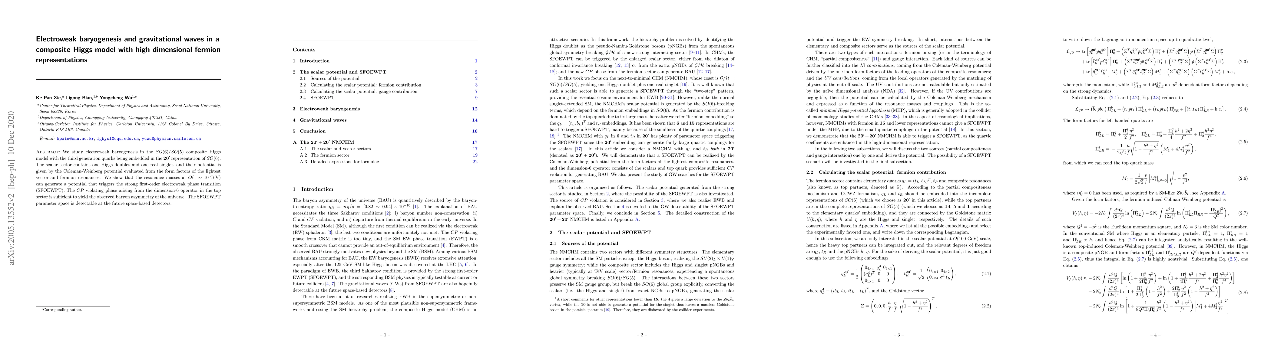 This paper investigates electroweak baryogenesis in a composite Higgs model where third-generation quarks are in a $\textbf{20}'$ representation of $SO(6)$. It demonstrates that resonance masses around $1-10$ TeV can induce a strong first-order electroweak phase transition, sufficient for generating the observed baryon asymmetry, and predicts detectable signatures in future space-based gravitational wave detectors.