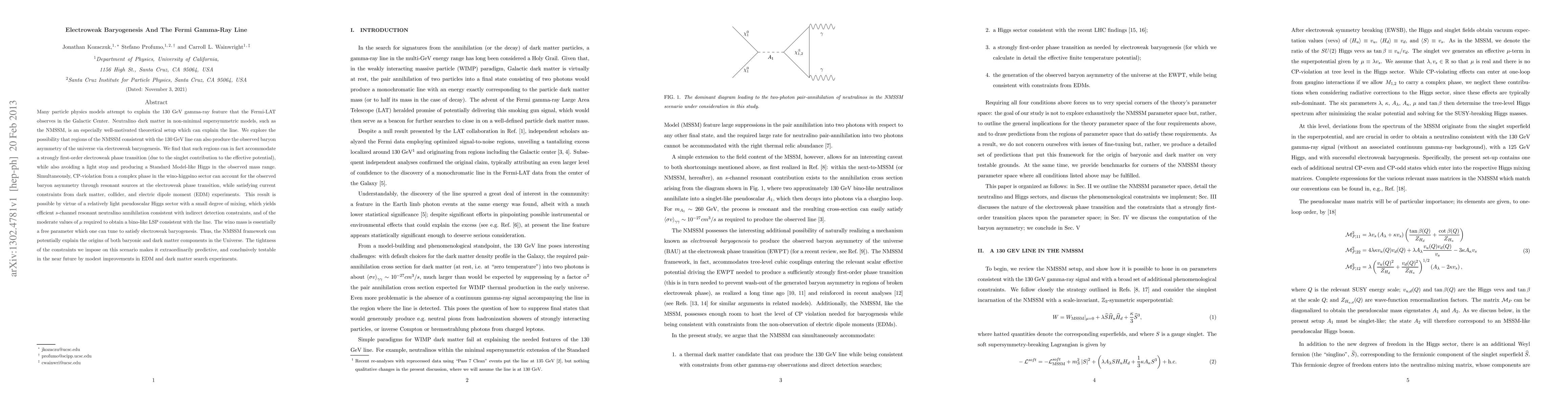 This paper explores how the Next-to-Minimal Supersymmetric Standard Model (NMSSM) can explain both the observed 130 GeV gamma-ray line and the universe's baryon asymmetry through electroweak baryogenesis. It finds that regions of the NMSSM consistent with the gamma-ray line can also accommodate a strongly first-order electroweak phase transition, while satisfying constraints from dark matter, collider, and electric dipole moment experiments.