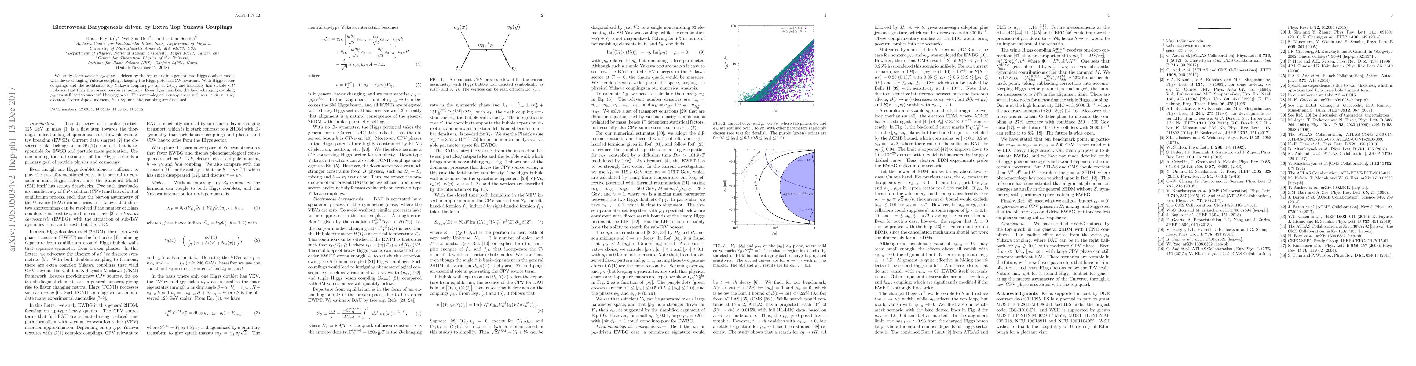 This paper explores electroweak baryogenesis driven by the top quark in a two-Higgs doublet model with extra Yukawa couplings, focusing on $CP$ violation from $\rho_{tt}$ and $\rho_{tc}$. It discusses potential phenomenological consequences including flavor-changing processes and new Higgs interactions.