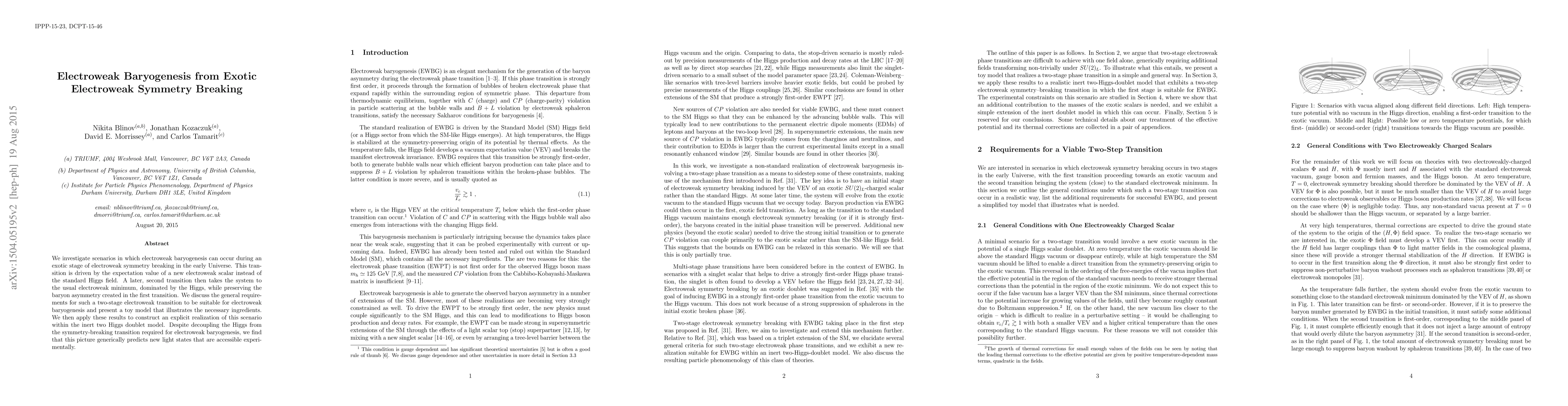 We investigate scenarios in which electroweak baryogenesis can occur during an exotic stage of electroweak symmetry breaking in the early Universe. This transition is driven by the expectation value of a new electroweak scalar instead of the standard Higgs field. A later, second transition then takes the system to the usual electroweak minimum, dominated by the Higgs, while preserving the baryon asymmetry created in the first transition. We discuss the general requirements for such a two-stage electroweak transition to be suitable for electroweak baryogenesis and present a toy model that illustrates the necessary ingredients. We then apply these results to construct an explicit realization of this scenario within the inert two Higgs doublet model. Despite decoupling the Higgs from the symmetry-breaking transition required for electroweak baryogenesis, we find that this picture generically predicts new light states that are accessible experimentally.