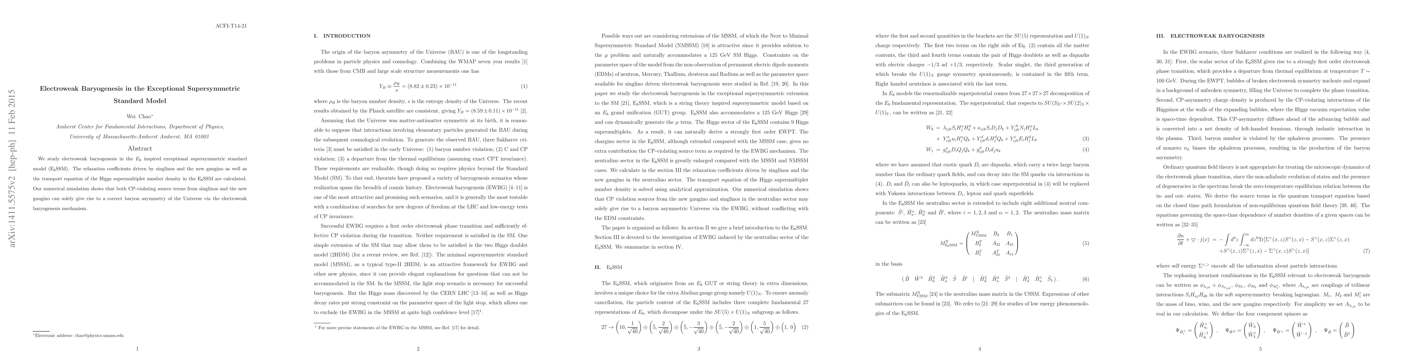 This paper investigates electroweak baryogenesis within the E_6SSM, calculating relaxation coefficients and transport equations. Numerical simulations demonstrate that CP-violating contributions from singlinos and a new gaugino can generate the observed baryon asymmetry via electroweak baryogenesis.