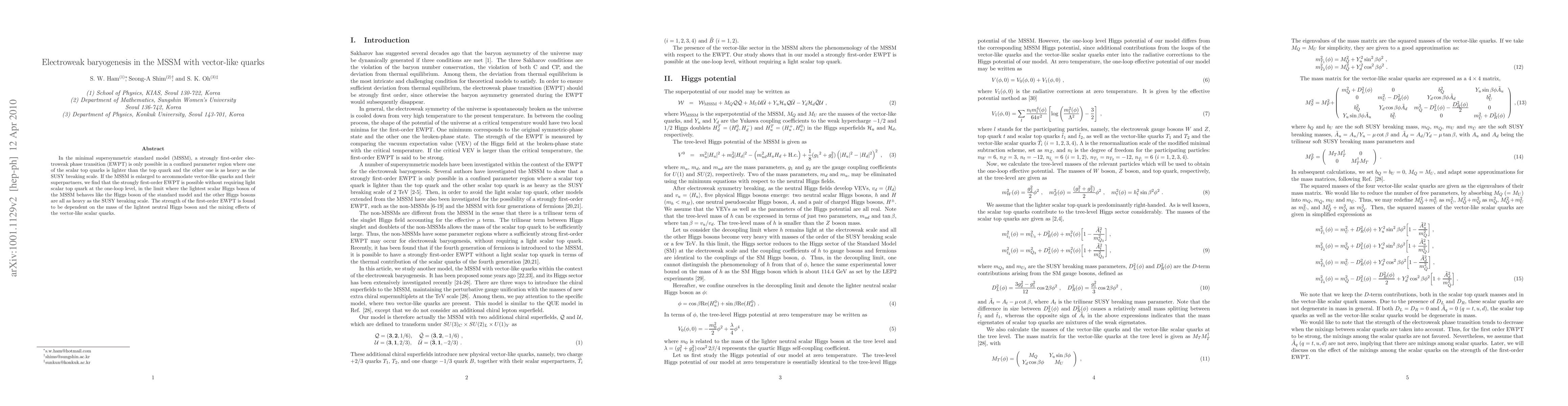 In the minimal supersymmetric standard model (MSSM), a strongly first-order electroweak phase transition (EWPT) is only possible in a confined parameter region where one of the scalar top quarks is lighter than the top quark and the other one is as heavy as the SUSY breaking scale. If the MSSM is enlarged to accommodate vector-like quarks and their superpartners, we find that the strongly first-order EWPT is possible without requiring light scalar top quark at the one-loop level, in the limit where the lightest scalar Higgs boson of the MSSM behaves like the Higgs boson of the standard model and the other Higgs bosons are all as heavy as the SUSY breaking scale. The strength of the first-order EWPT is found to be dependent on the mass of the lightest neutral Higgs boson and the mixing effects of the vector-like scalar quarks.