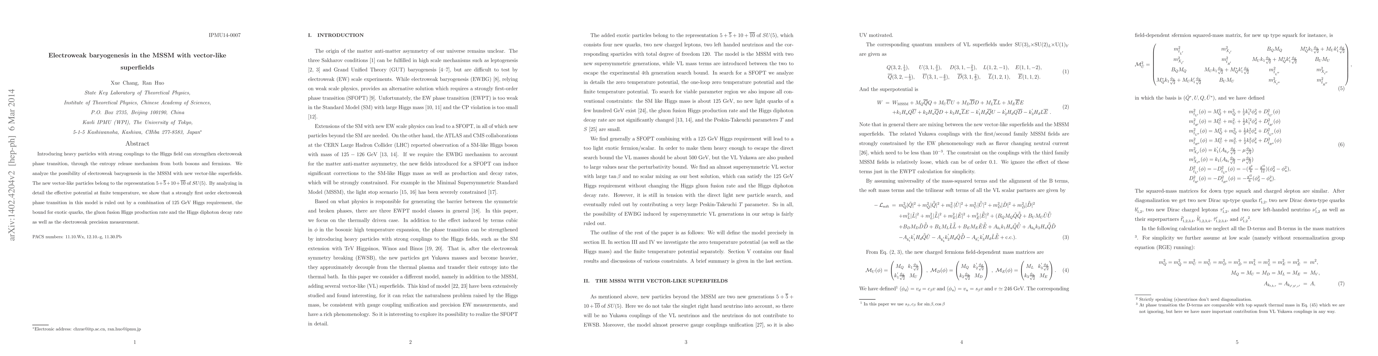 This paper investigates the potential for electroweak baryogenesis in the Minimal Supersymmetric Standard Model (MSSM) augmented with vector-like superfields. It concludes that the inclusion of these new particles does not support a strongly first-order electroweak phase transition, due to constraints from the Higgs mass, exotic quark bounds, and precision electroweak measurements.
