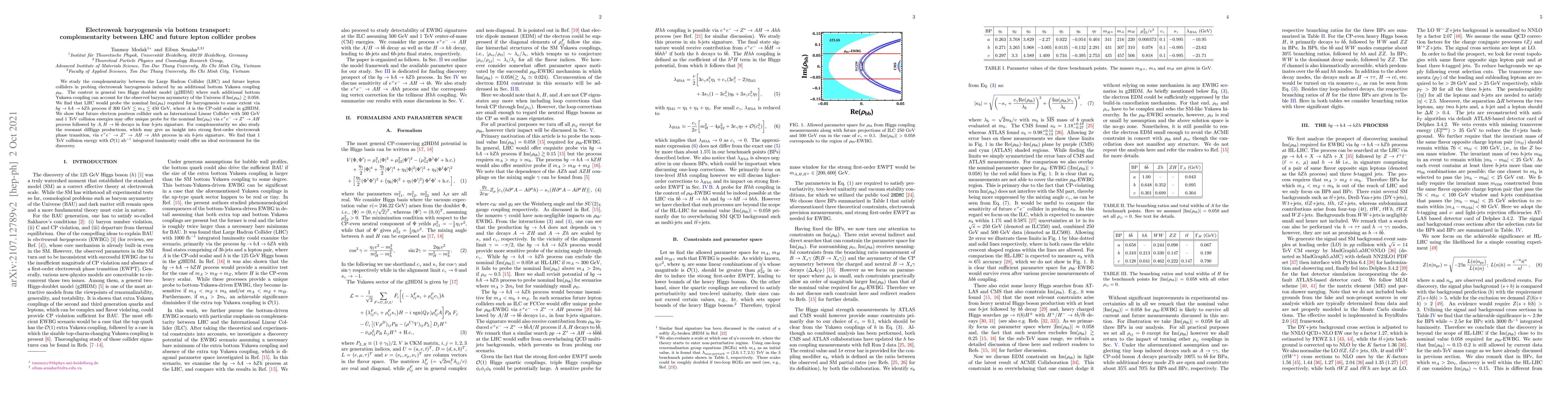 We study the complementarity between the Large Hadron Collider (LHC) and future lepton colliders in probing electroweak baryogenesis induced by an additional bottom Yukawa coupling $\rho_{bb}$. The context is general two Higgs doublet model (g2HDM) where such additional bottom Yukawa coupling can account for the observed baryon asymmetry of the Universe if $\mbox{Im}(\rho_{bb}) \gtrsim 0.058$. We find that LHC would probe the nominal $\mbox{Im}(\rho_{bb})$ required for baryogenesis to some extent via $bg \to bA \to bZh$ process if $300~\mbox{GeV}\lesssim m_A \lesssim 450$ GeV, where $A$ is the CP-odd scalar in g2HDM. We show that future electron positron collider such as International Linear Collider with $500$ GeV and 1 TeV collision energies may offer unique probe for the nominal $\mbox{Im}(\rho_{bb})$ via $e^+ e^- \to Z^*\to A H$ process followed by $A,H \to b \bar b$ decays in four $b$-jets signature. For complementarity we also study the resonant diHiggs productions, which may give an insight into strong first-order electroweak phase transition, via $e^+ e^- \to Z^*\to A H \to A h h$ process in six $b$-jets signature. We find that 1 TeV collision energy with $\mathcal{O}(1)~\text{ab}^{-1}$ integrated luminosity could offer an ideal environment for the discovery.