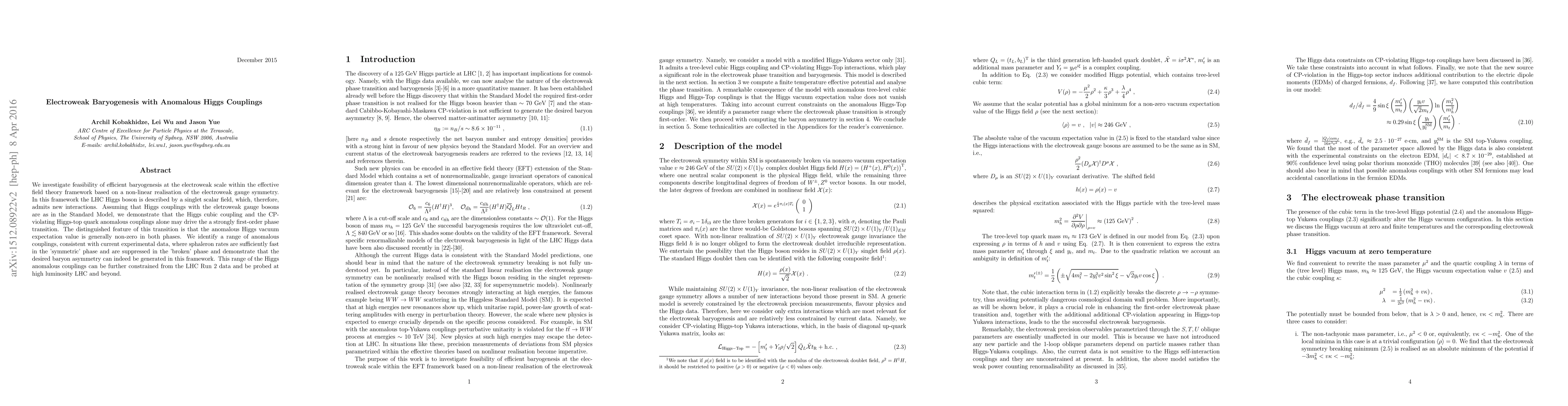 We investigate feasibility of efficient baryogenesis at the electroweak scale within the effective field theory framework based on a non-linear realisation of the electroweak gauge symmetry. In this framework the LHC Higgs boson is described by a singlet scalar field, which, therefore, admits new interactions. Assuming that Higgs couplings with the eletroweak gauge bosons are as in the Standard Model, we demonstrate that the Higgs cubic coupling and the CP-violating Higgs-top quark anomalous couplings alone may drive the a strongly first-order phase transition. The distinguished feature of this transition is that the anomalous Higgs vacuum expectation value is generally non-zero in both phases. We identify a range of anomalous couplings, consistent with current experimental data, where sphaleron rates are sufficiently fast in the 'symmetric' phase and are suppressed in the 'broken' phase and demonstrate that the desired baryon asymmetry can indeed be generated in this framework. This range of the Higgs anomalous couplings can be further constrained from the LHC Run 2 data and be probed at high luminosity LHC and beyond.
