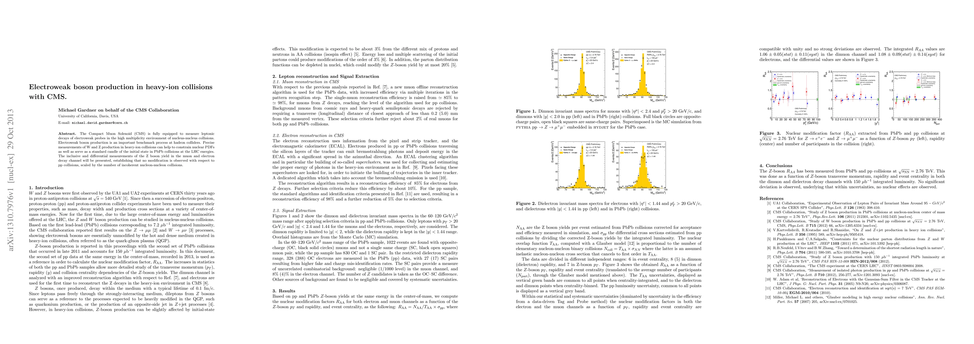 The CMS experiment measures electroweak boson production in heavy-ion collisions, finding no modification in Z boson yields compared to proton-proton collisions, scaled by nucleon-nucleon interaction counts. These results provide insights into nuclear parton distribution functions and serve as a standard for initial states in PbPb collisions.