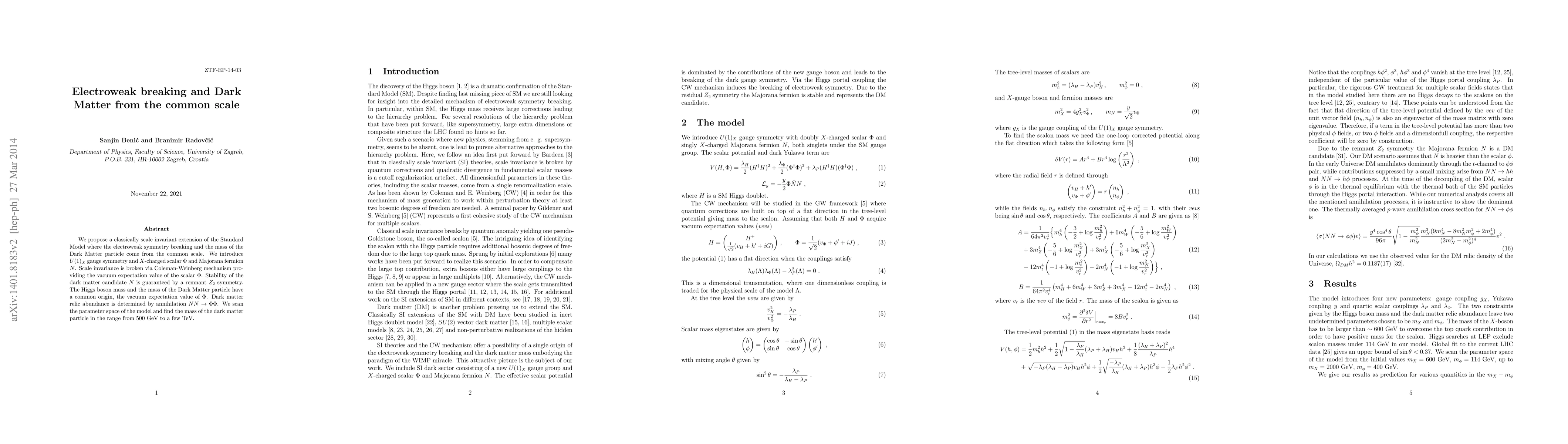This paper proposes a scale invariant extension of the Standard Model where electroweak symmetry breaking and Dark Matter mass originate from a common scale. It introduces $U(1)_X$ symmetry and a scalar $\Phi$ and a Majorana fermion $N$ to ensure stability and dark matter relic abundance through annihilation processes. The model predicts Dark Matter masses ranging from 500 GeV to a few TeV.