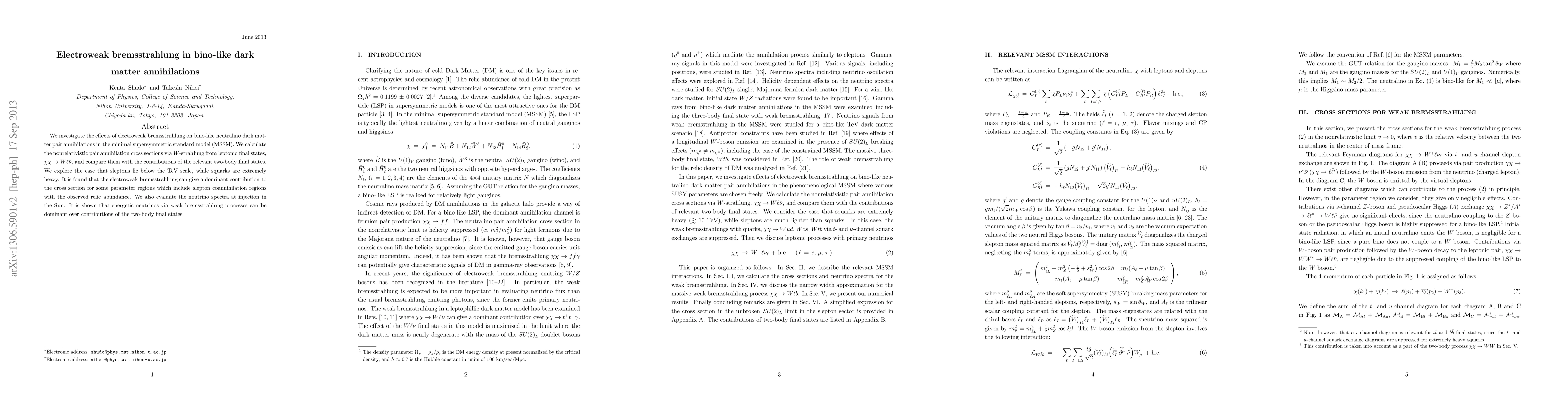 This paper examines the impact of electroweak bremsstrahlung on bino-like neutralino dark matter annihilations within the MSSM, finding that it can dominate the annihilation cross section in certain parameter regions, especially those involving slepton coannihilation. It also highlights that neutrinos from these processes can surpass the contributions from two-body final states.
