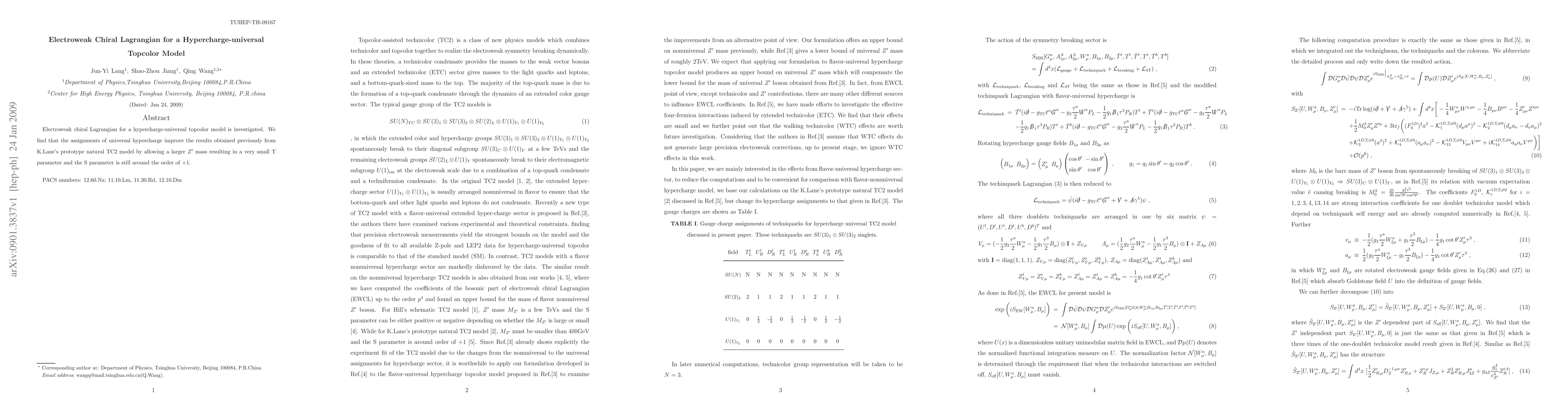 This paper investigates the electroweak chiral Lagrangian in a hypercharge-universal topcolor model, finding that universal hypercharge assignments allow for a larger Z' mass, resulting in a very small T parameter and an S parameter around +1. This improves upon previous results from K. Lane's natural TC2 model.