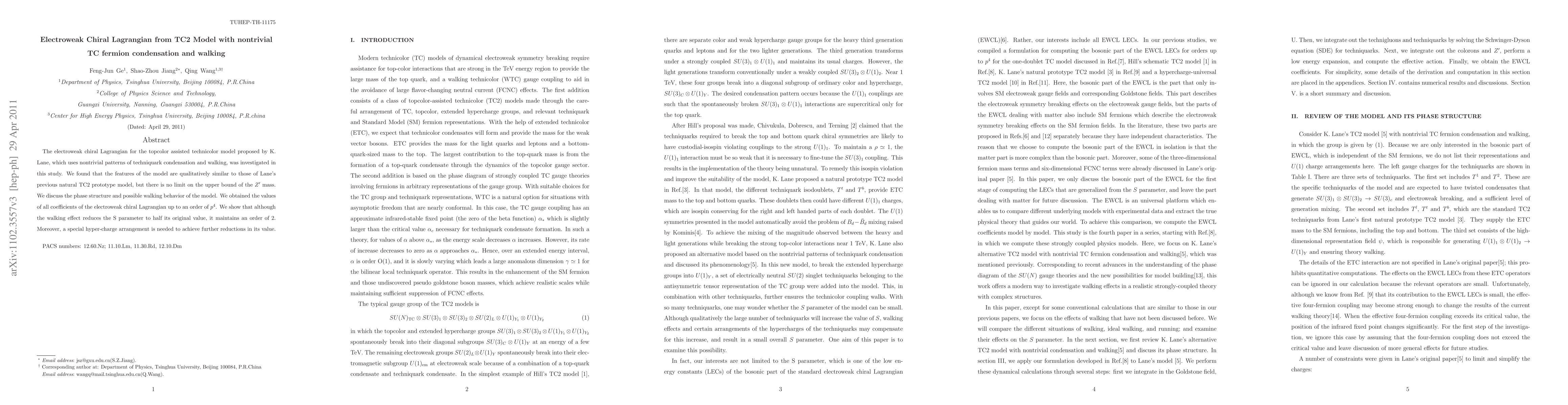 This study investigates the electroweak chiral Lagrangian for a topcolor assisted technicolor model featuring nontrivial techniquark condensation and walking behavior. The model's features are similar to previous natural TC2 models, but lacks an upper bound on the Z' mass, while walking behavior reduces the S parameter by half but still maintains an order of 2.