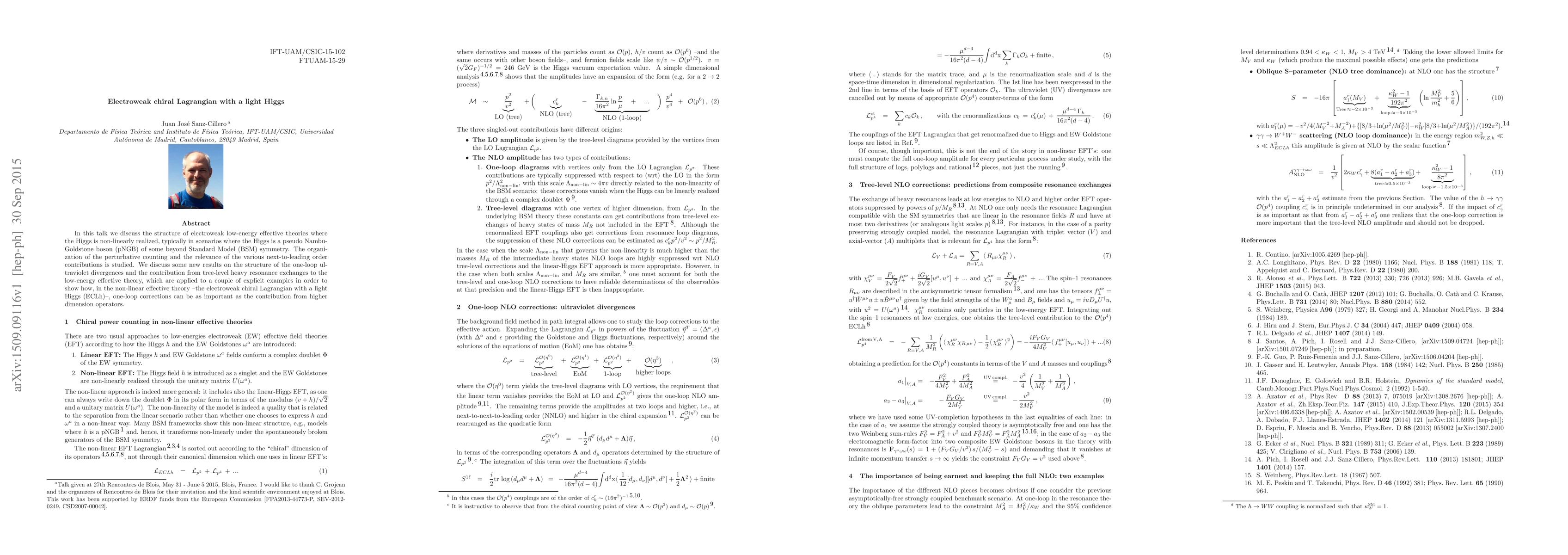 This paper explores the electroweak chiral Lagrangian with a light Higgs realized non-linearly, focusing on next-to-leading order contributions and one-loop ultraviolet divergences. It highlights the significance of one-loop corrections compared to higher dimension operators in this framework.