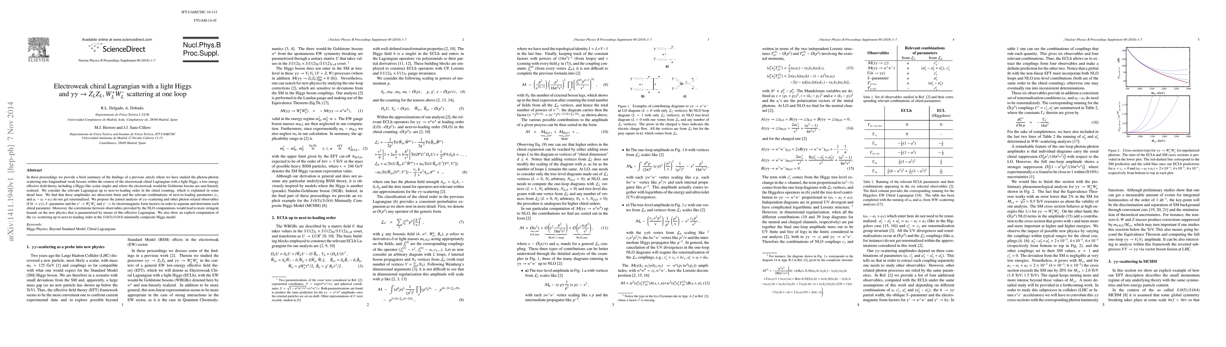 In these proceedings we provide a brief summary of the findings of a previous article where we have studied the photon-photon scattering into longitudinal weak bosons within the context of the electroweak chiral Lagrangian with a light Higgs, a low-energy effective field theory including a Higgs-like scalar singlet and where the electroweak would-be Goldstone bosons are non-linearly realized. We consider the relevant Lagrangian up to next-to-leading order in the chiral counting, which is explained in some detail here. We find that these amplitudes are ultraviolet finite and the relevant combinations of next-to-leading parameters ($c_\gamma$ and $a_1-a_2+a_3$) do not get renormalized. We propose the joined analysis of $\gamma\gamma$-scattering and other photon related observables ($\Gamma(h\to\gamma\gamma)$, $S$--parameter and the $\gamma^*\to W^+_LW^-_L$ and $\gamma^*\to h\gamma$ electromagnetic form-factors) in order to separate and determine each chiral parameter. Moreover, the correlations between observables provided by the NLO computations would lead to more stringent bounds on the new physics that is parametrized by means of this effective Lagrangian. We also show an explicit computation of the $\gamma\gamma$--scattering up to next-to-leading order in the $SO(5)/SO(4)$ minimally composite Higgs model.