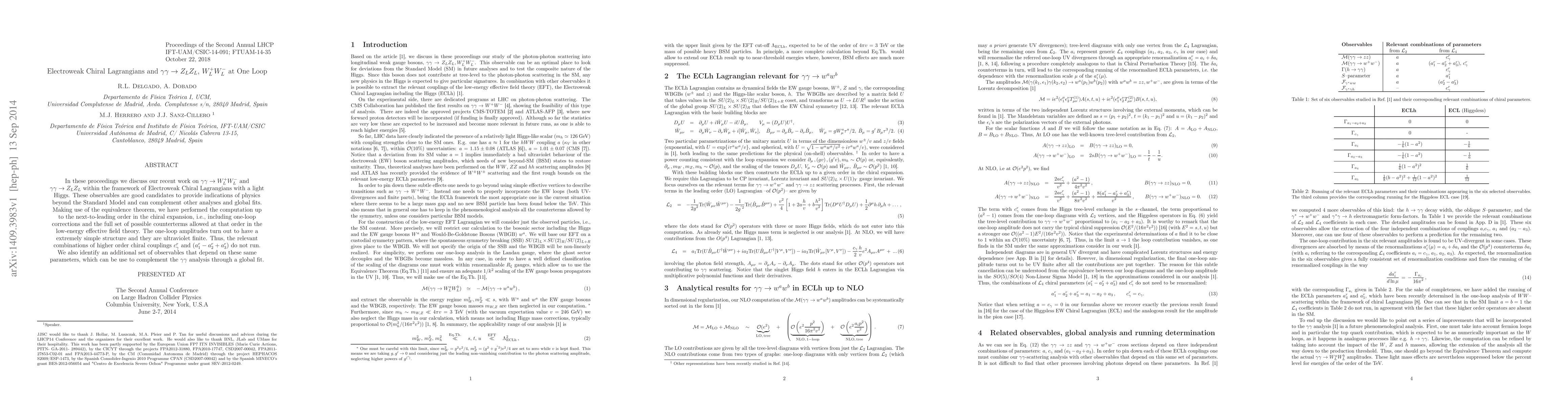 In these proceedings we discuss our recent work on $\gamma\gamma\to W^+_L W^-_L$ and $\gamma\gamma\to Z_L Z_L$ within the framework of Electroweak Chiral Lagrangians with a light Higgs. These observables are good candidates to provide indications of physics beyond the Standard Model and can complement other analyses and global fits. Making use of the equivalence theorem, we have performed the computation up to the next-to-leading order in the chiral expansion, i.e., including one-loop corrections and the full set of possible counterterms allowed at that order in the low-energy effective field theory. The one-loop amplitudes turn out to have a extremely simple structure and they are ultraviolet finite. Thus, the relevant combinations of higher order chiral couplings $c_\gamma^r$ and $(a_1^r-a_2^r+a_3^r)$ do not run. We also identify an additional set of observables that depend on these same parameters, which can be use to complement the $\gamma\gamma$ analysis through a global fit.