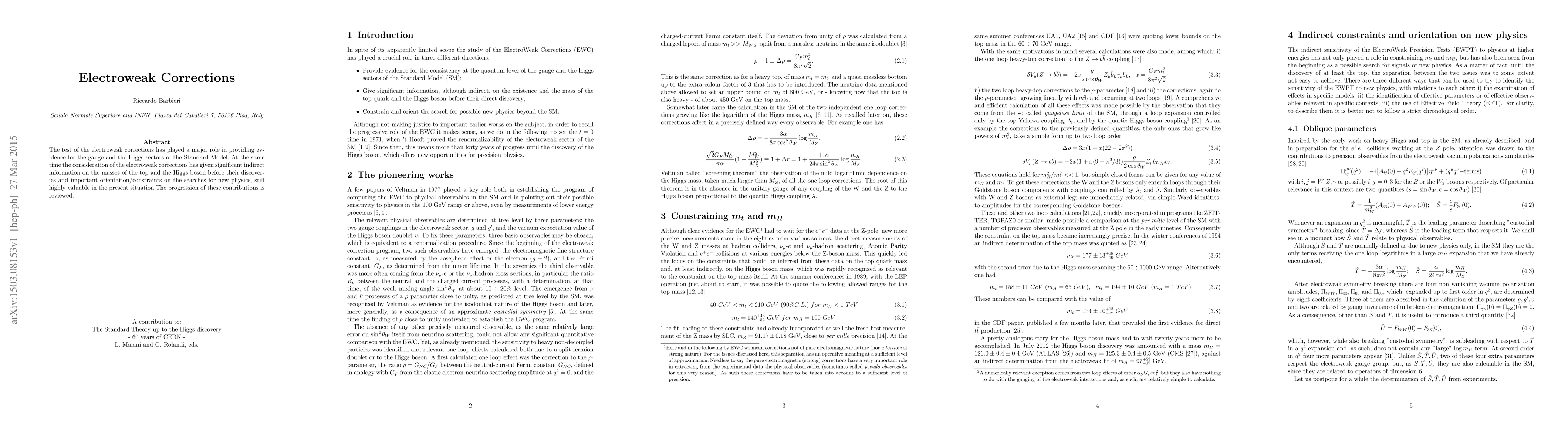 The test of the electroweak corrections has played a major role in providing evidence for the gauge and the Higgs sectors of the Standard Model. At the same time the consideration of the electroweak corrections has given significant indirect information on the masses of the top and the Higgs boson before their discoveries and important orientation/constraints on the searches for new physics, still highly valuable in the present situation.The progression of these contributions is reviewed.