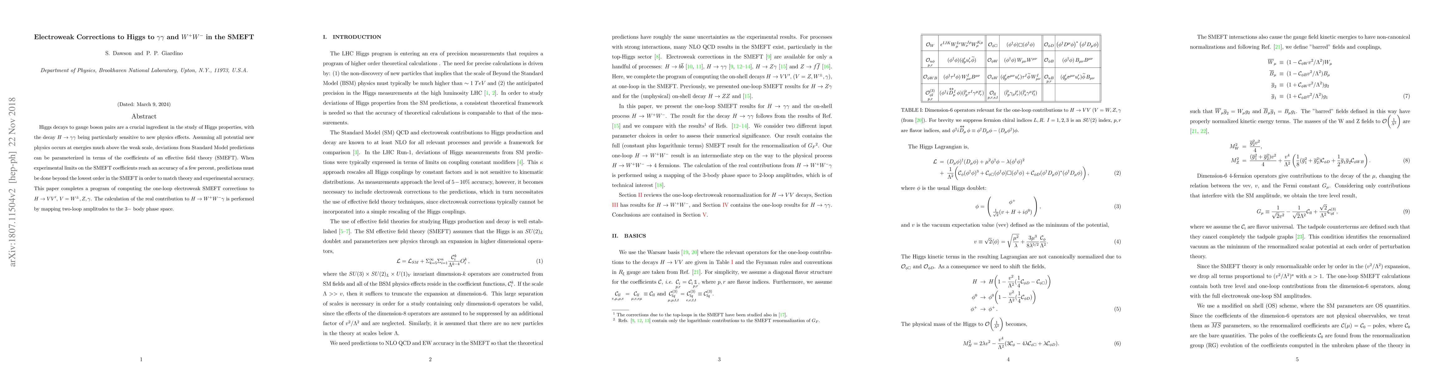 This paper computes one-loop electroweak corrections within the Standard Model Effective Field Theory (SMEFT) for Higgs decay to gauge boson pairs, focusing on $H\rightarrow\gamma\gamma$ and $H\rightarrow W^+W^-$. It completes the calculation of these corrections to match the precision of experimental limits, including the real contribution to $H\rightarrow W^+W^-\gamma$ via two-loop amplitude mapping.