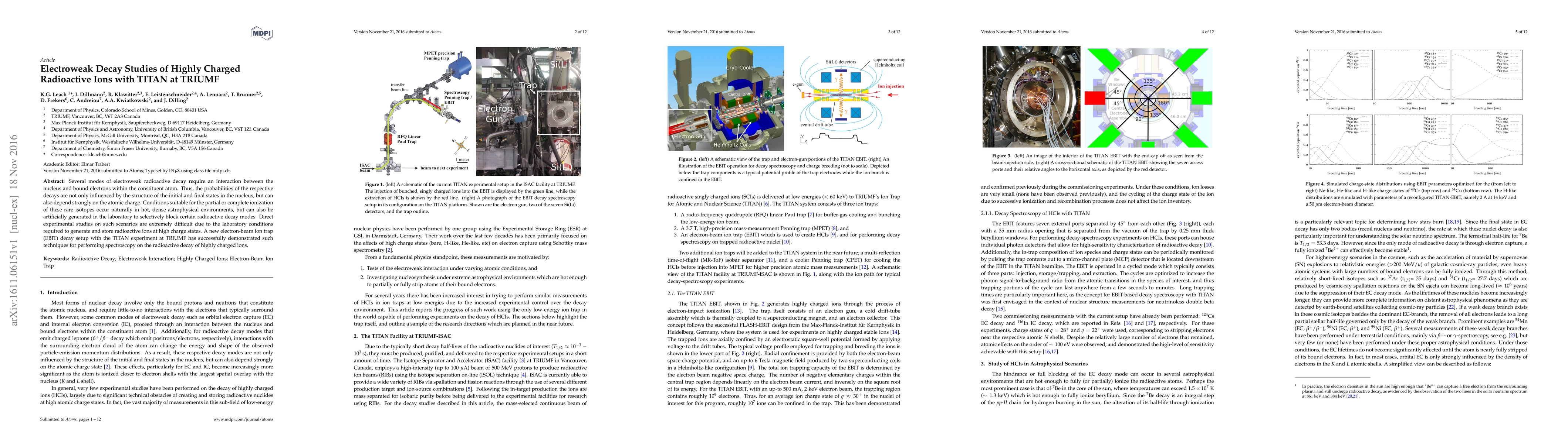 The TITAN experiment at TRIUMF employs an electron-beam ion trap (EBIT) to study electroweak decay in highly charged radioactive ions, allowing for the selective blocking of decay modes by manipulating atomic charge states. This innovative setup facilitates direct experimental investigations into decay processes influenced by both nuclear and electronic structures.