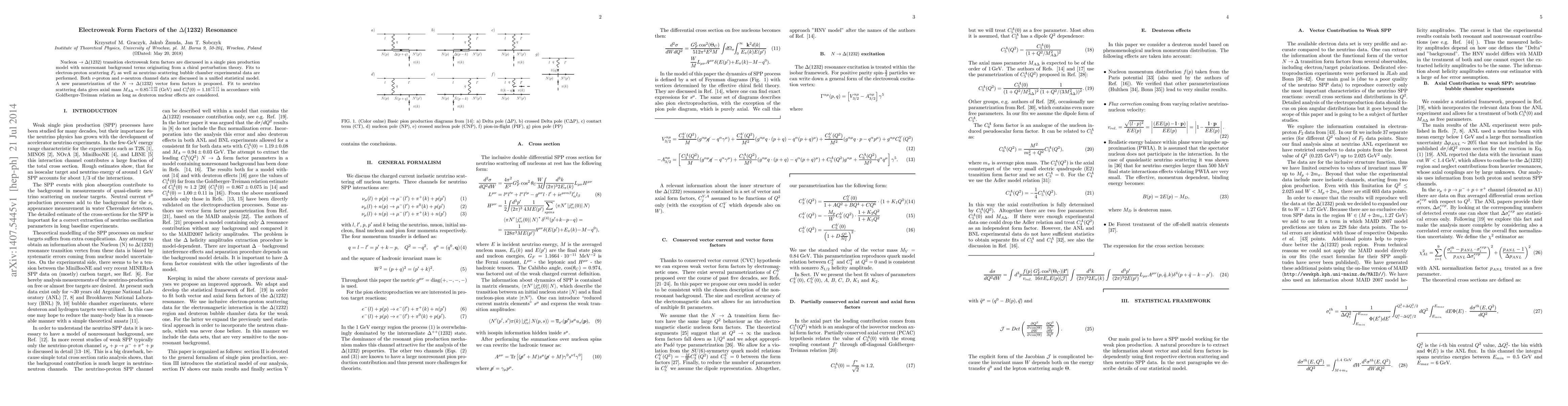 Nucleon $\to \Delta(1232)$ transition electroweak form factors are discussed in a single pion production model with nonresonant background terms originating from a chiral perturbation theory. Fits to electron-proton scattering $F_2$ as well as neutrino scattering bubble chamber experimental data are performed. Both $\nu$-proton and $\nu$-neutron channel data are discussed in a unified statistical model. A new parametrization of the $N\to\Delta(1232)$ vector form factors is proposed. Fit to neutrino scattering data gives axial mass $M_{A\Delta}=0.85{+0.09}{-0.08}\;$(GeV) and $C_5^A(0) = 1.10{+0.15}{-0.14}$ in accordance with Goldberger-Treiman relation as long as deuteron nuclear effects are considered.
