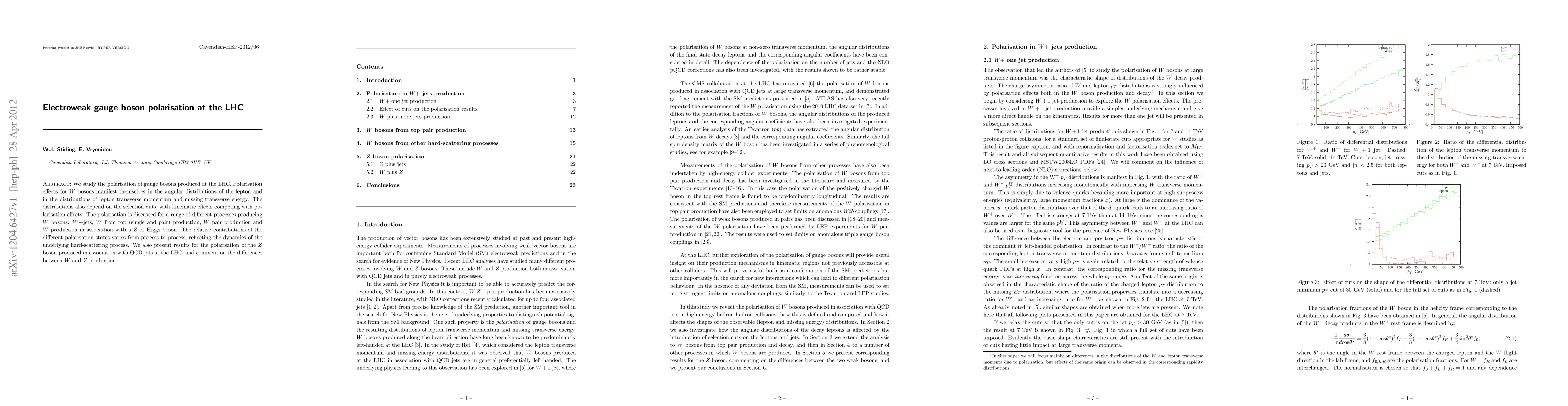 This paper investigates the polarisation of electroweak gauge bosons (W and Z) produced at the LHC, focusing on how polarisation affects angular distributions and lepton properties. It examines various production processes, highlighting the varying contributions of different polarisation states and discusses differences between W and Z bosons.