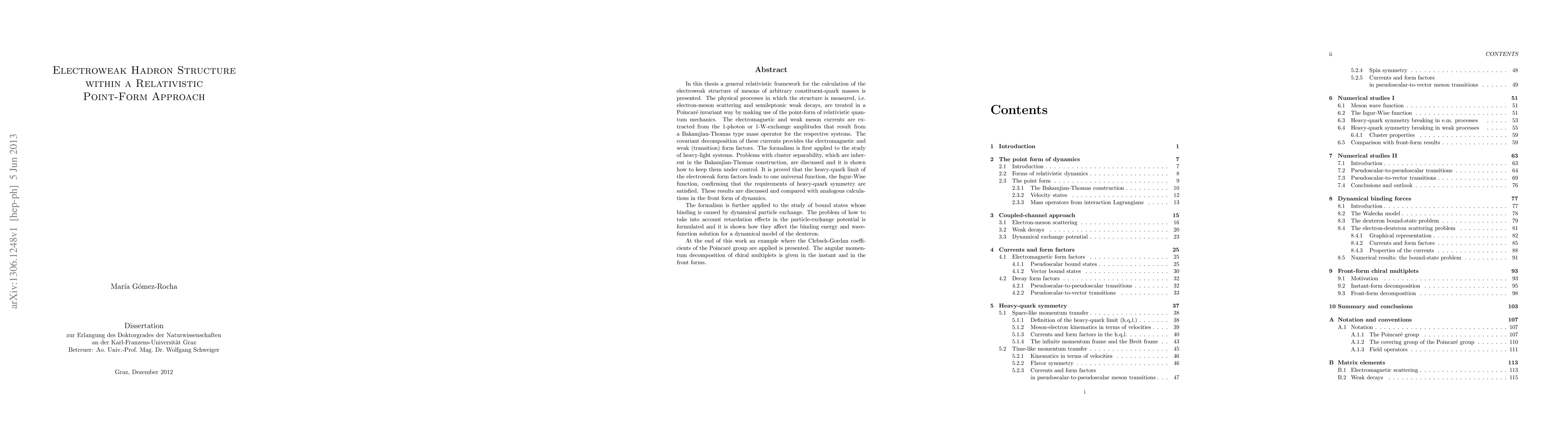 This paper presents a relativistic framework for calculating the electroweak structure of mesons using a Poincaré invariant point-form approach, focusing on heavy-light systems and the Isgur-Wise function. It also explores retardation effects in particle-exchange potentials and applies the formalism to the deuteron model.