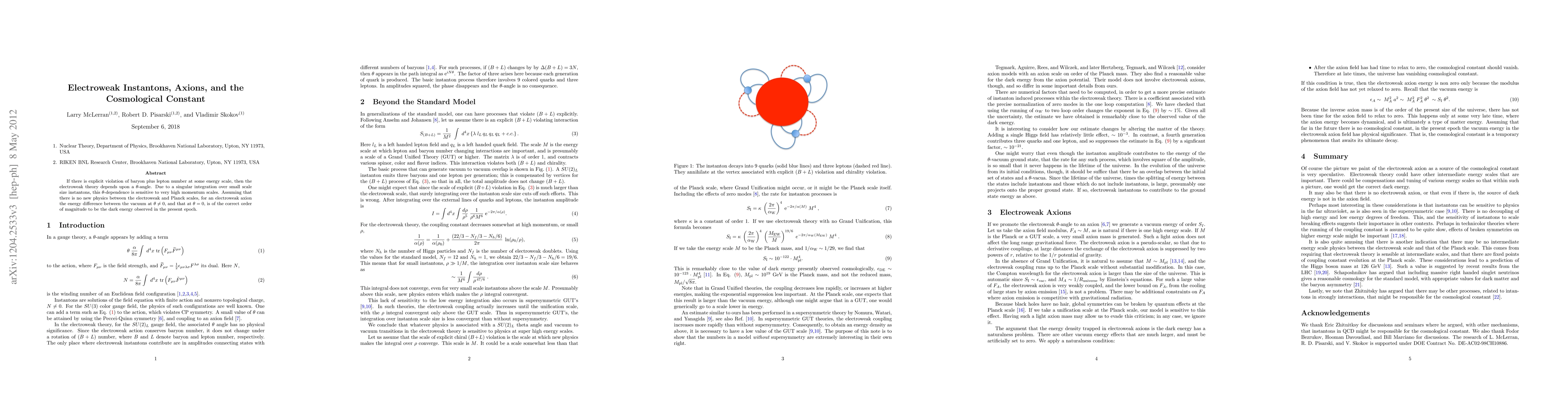 If there is explicit violation of baryon plus lepton number at some energy scale, then the electroweak theory depends upon a {\theta}-angle. Due to a singular integration over small scale size instantons, this {\theta}-dependence is sensitive to very high momentum scales. Assuming that there is no new physics between the electroweak and Planck scales, for an electroweak axion the energy difference between the vacuum at {\theta} /= 0, and that at {\theta} = 0, is of the correct order of magnitude to be the dark energy observed in the present epoch.