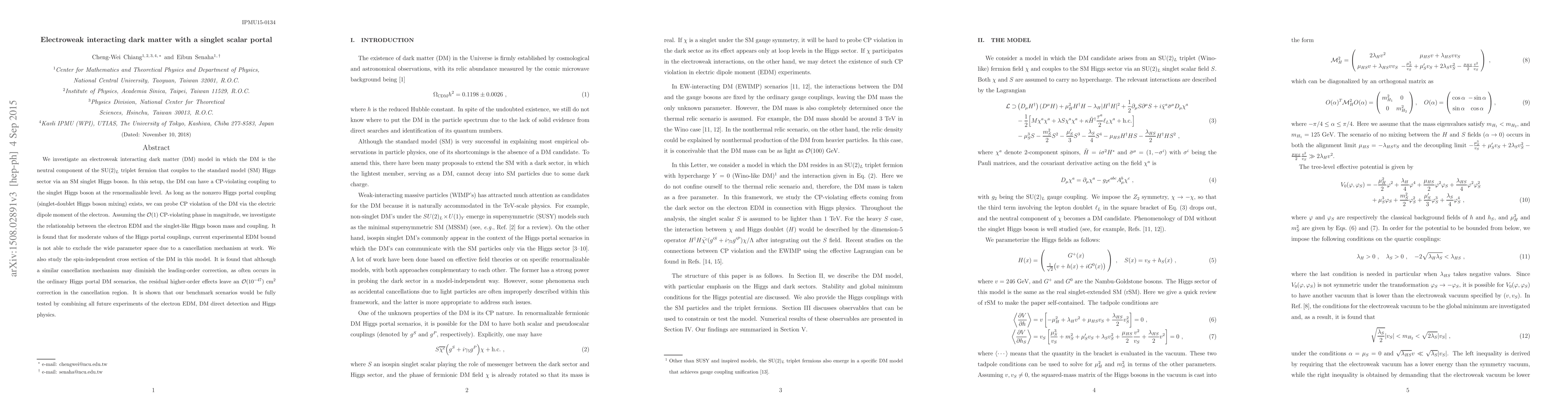We investigate an electroweak interacting dark matter (DM) model in which the DM is the neutral component of the SU$(2)_L$ triplet fermion that couples to the standard model (SM) Higgs sector via an SM singlet Higgs boson. In this setup, the DM can have a CP-violating coupling to the singlet Higgs boson at the renormalizable level. As long as the nonzero Higgs portal coupling (singlet-doublet Higgs boson mixing) exists, we can probe CP violation of the DM via the electric dipole moment of the electron. Assuming the $\mathcal{O}(1)$ CP-violating phase in magnitude, we investigate the relationship between the electron EDM and the singlet-like Higgs boson mass and coupling. It is found that for moderate values of the Higgs portal couplings, current experimental EDM bound is not able to exclude the wide parameter space due to a cancellation mechanism at work. We also study the spin-independent cross section of the DM in this model. It is found that although a similar cancellation mechanism may diminish the leading-order correction, as often occurs in the ordinary Higgs portal DM scenarios, the residual higher-order effects leave an $\mathcal{O}(10^{-47})~{\rm cm}^2$ correction in the cancellation region. It is shown that our benchmark scenarios would be fully tested by combining all future experiments of the electron EDM, DM direct detection and Higgs physics.