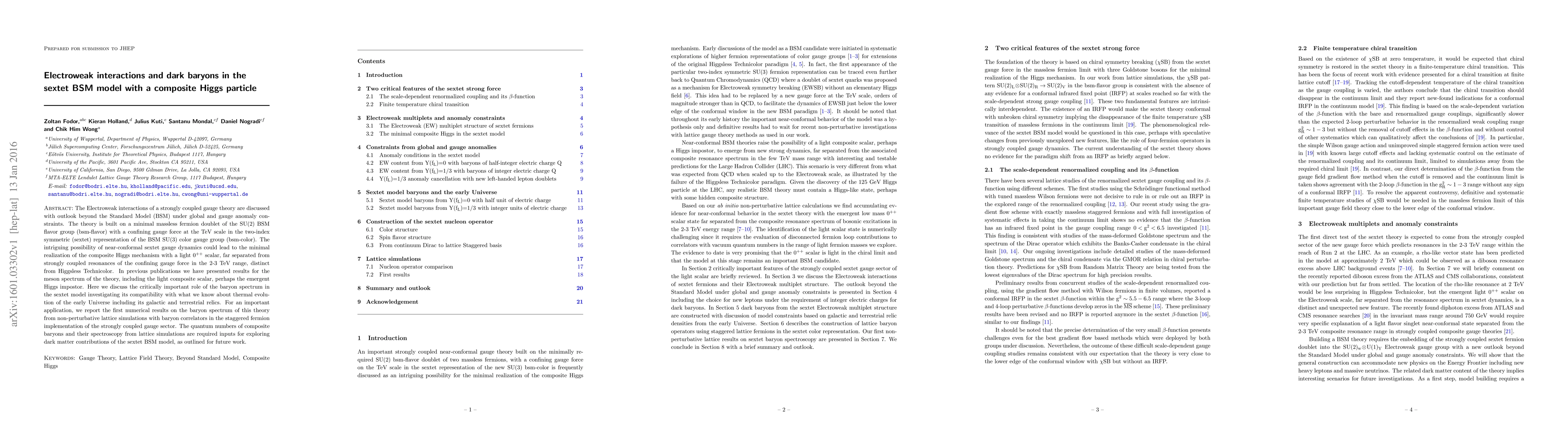 This paper explores the electroweak interactions in a sextet BSM model featuring a composite Higgs particle, focusing on the baryon spectrum and its implications for dark matter. It employs non-perturbative lattice simulations to investigate the composite baryons, providing essential data for understanding the model's contribution to dark matter in the early Universe.