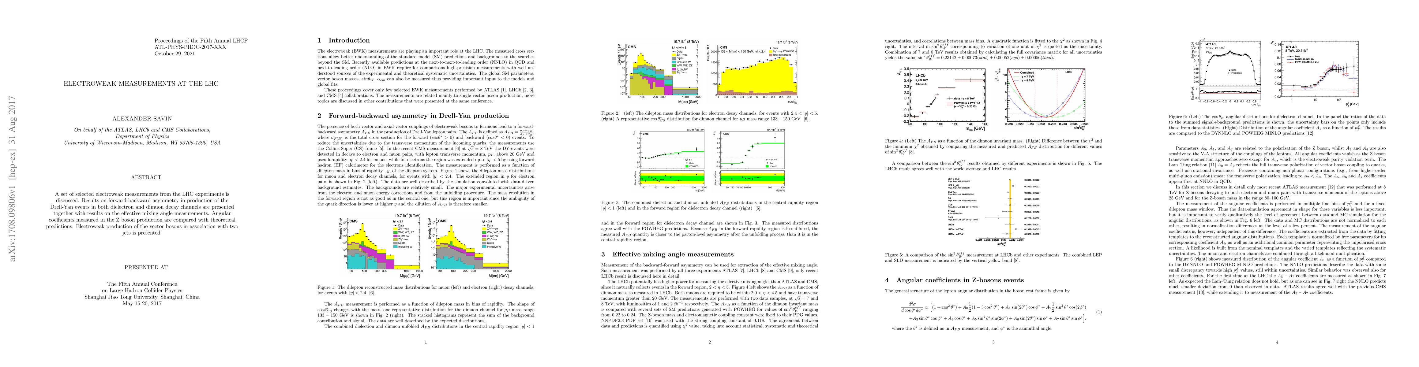 This paper discusses selected electroweak measurements from LHC experiments, focusing on forward-backward asymmetry in Drell-Yan events and effective mixing angle measurements, comparing angular coefficients of Z boson production with theoretical predictions, and presenting results on electroweak production of vector bosons in association with two jets.