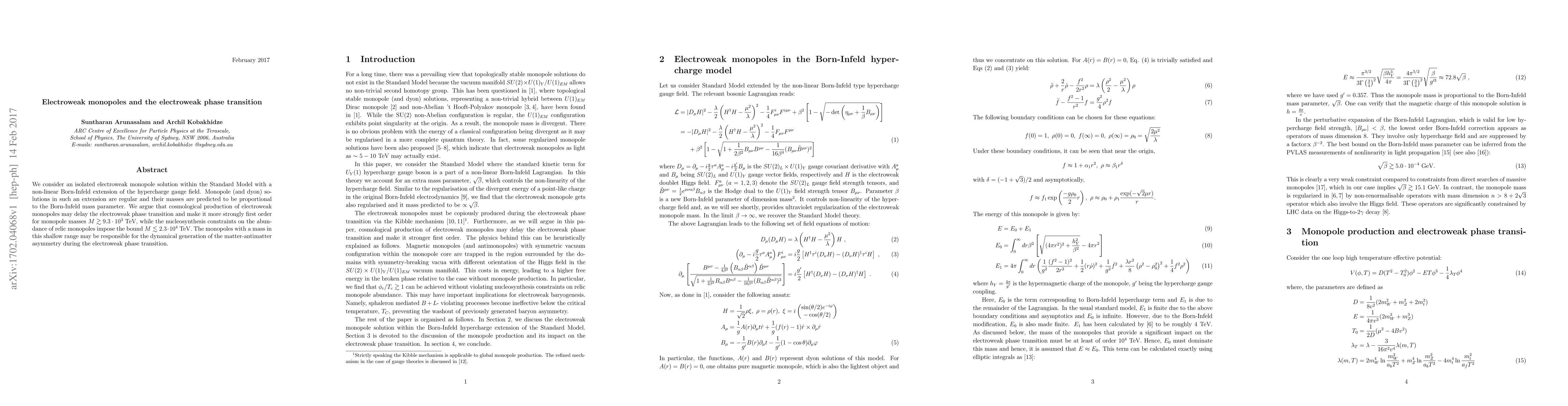 We consider an isolated electroweak monopole solution within the Standard Model with a non-linear Born-Infeld extension of the hypercharge gauge field. Monopole (and dyon) solutions in such an extension are regular and their masses are predicted to be proportional to the Born-Infeld mass parameter. We argue that cosmological production of electroweak monopoles may delay the electroweak phase transition and make it more strongly first order for monopole masses $M\gtrsim 9.3\cdot 10^3$ TeV, while the nucleosynthesis constraints on the abundance of relic monopoles impose the bound $M\lesssim 2.3\cdot 10^4$ TeV. The monopoles with a mass in this shallow range may be responsible for the dynamical generation of the matter-antimatter asymmetry during the electroweak phase transition.