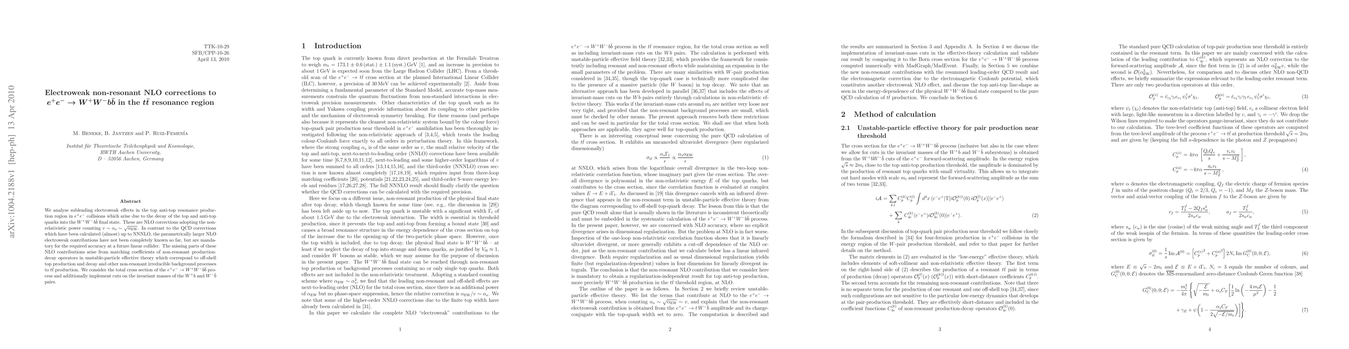 This paper analyzes subleading electroweak NLO corrections in e+ e- collisions within the top anti-top resonance region, focusing on the W+ W- b bbar final state. It completes the missing parts of these contributions, crucial for future collider precision, by addressing non-resonant production-decay operators and implementing cuts on W-pair invariant masses.