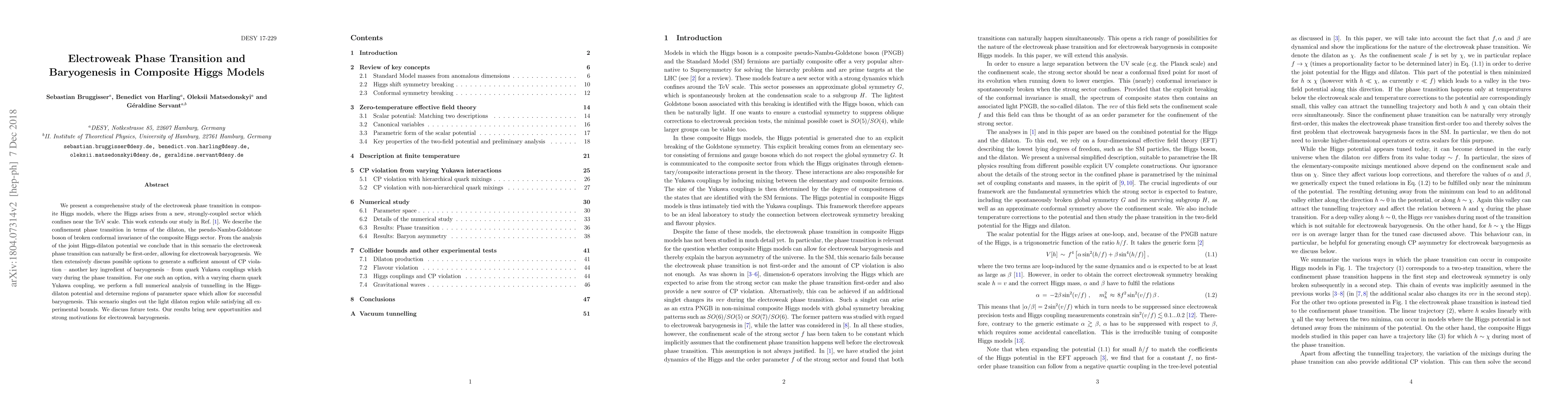 We present a comprehensive study of the electroweak phase transition in composite Higgs models, where the Higgs arises from a new, strongly-coupled sector which confines near the TeV scale. This work extends our study in Ref. [1]. We describe the confinement phase transition in terms of the dilaton, the pseudo-Nambu-Goldstone boson of broken conformal invariance of the composite Higgs sector. From the analysis of the joint Higgs-dilaton potential we conclude that in this scenario the electroweak phase transition can naturally be first-order, allowing for electroweak baryogenesis. We then extensively discuss possible options to generate a sufficient amount of CP violation - another key ingredient of baryogenesis - from quark Yukawa couplings which vary during the phase transition. For one such an option, with a varying charm quark Yukawa coupling, we perform a full numerical analysis of tunnelling in the Higgs-dilaton potential and determine regions of parameter space which allow for successful baryogenesis. This scenario singles out the light dilaton region while satisfying all experimental bounds. We discuss future tests. Our results bring new opportunities and strong motivations for electroweak baryogenesis.