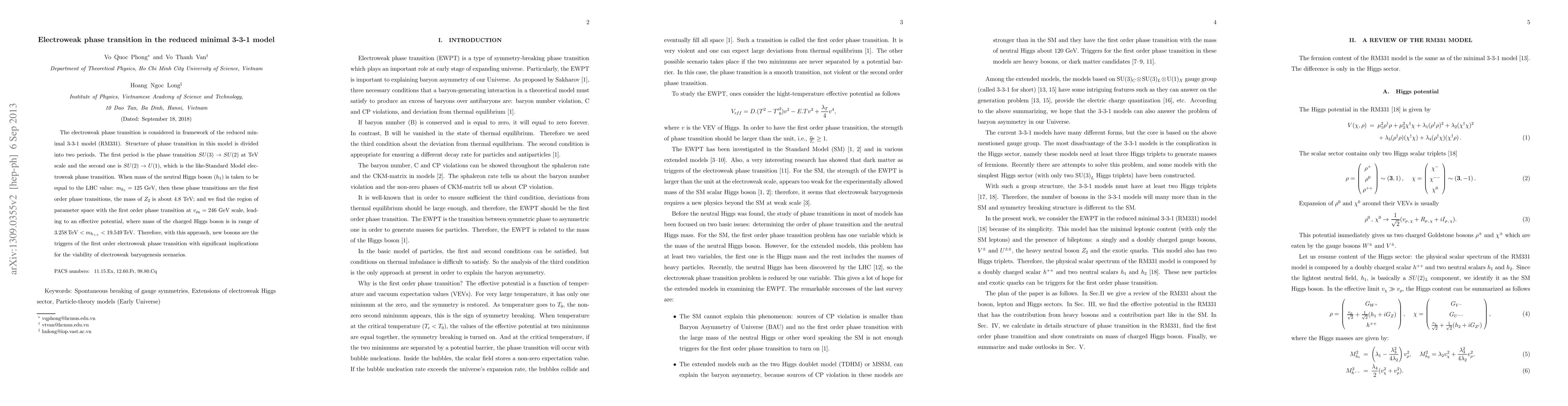 This paper examines the electroweak phase transition in the reduced minimal 3-3-1 model (RM331), identifying two distinct phase transitions: SU(3) to SU(2) at the TeV scale and SU(2) to U(1) akin to the Standard Model. With a neutral Higgs boson mass of 125 GeV, these transitions are first-order, triggering new bosons that significantly impact electroweak baryogenesis.