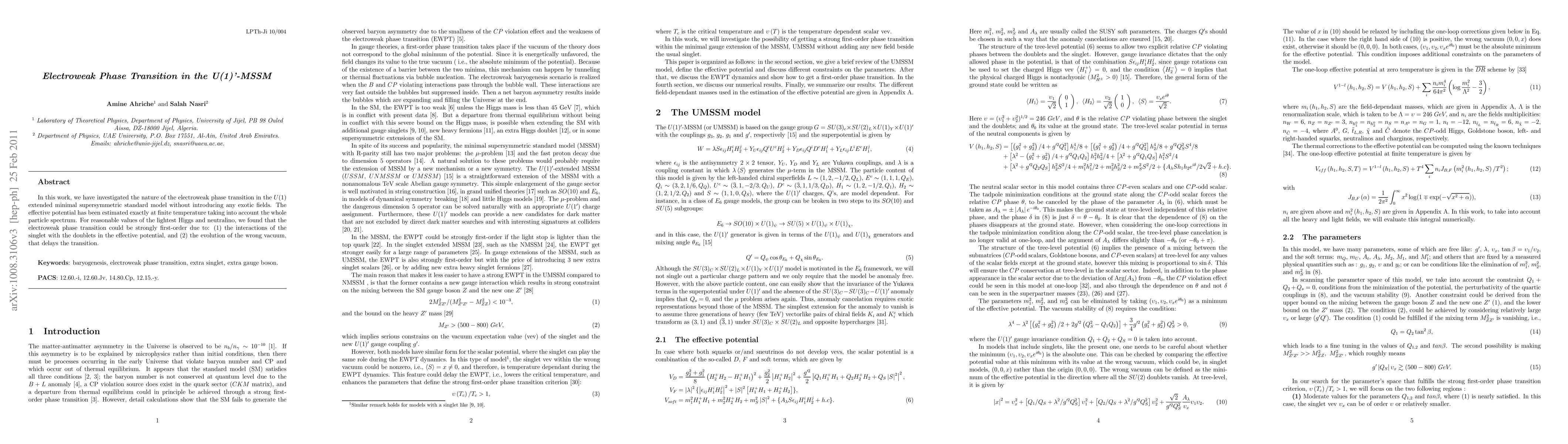 In this work, we have investigated the nature of the electroweak phase transition in the U(1) extended minimal supersymmetric standard model without introducing any exotic fields. The effective potential has been estimated exactly at finite temperature taking into account the whole particle spectrum. For reasonable values of the lightest Higgs and neutralino, we found that the electroweak phase transition could be strongly first order due to: (1) the interactions of the singlet with the doublets in the effective potential, and (2) the evolution of the wrong vacuum that delays the transition.