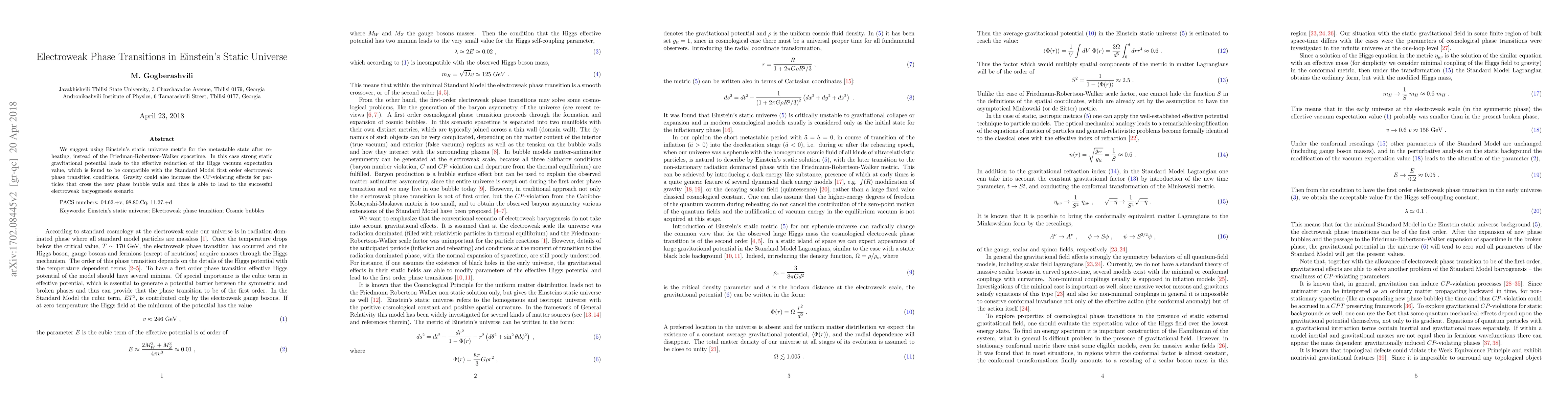 This paper proposes using Einstein's static universe metric to model the metastable state post-reheating, showing that strong static gravitational potential reduces the Higgs vacuum expectation value, aligning with first-order electroweak phase transition conditions. Gravity enhances CP-violating effects in phase bubble transitions, potentially enabling successful electroweak baryogenesis.