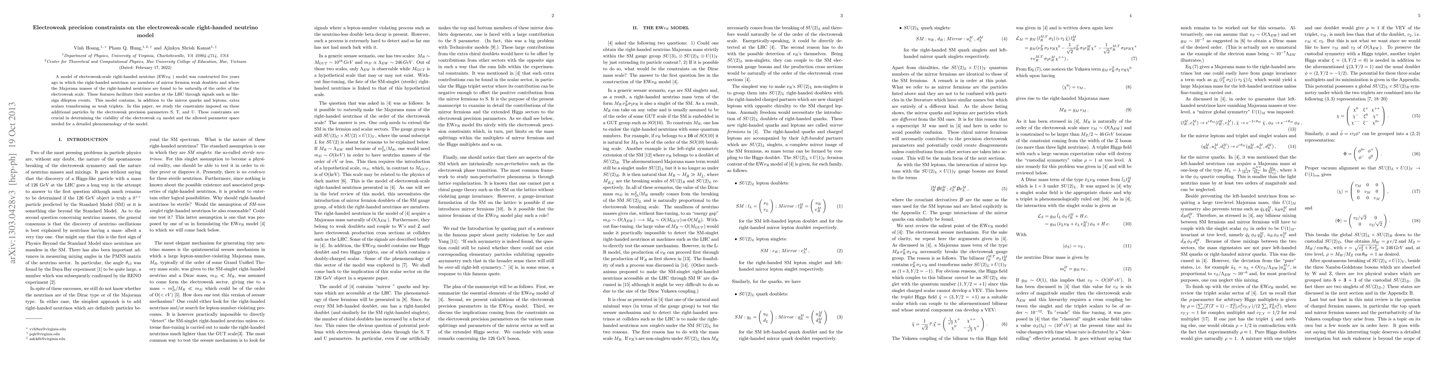 A model of electroweak-scale right-handed neutrino (\ewnur) model was constructed five years ago in which the right-handed neutrinos are members of mirror fermion weak doublets and where the Majorana masses of the right-handed neutrinos are found to be {\em naturally} of the order of the electroweak scale. These features facilitate their searches at the LHC through signals such as like-sign dilepton events. This model contains, in addition to the mirror quarks and leptons, extra scalars transforming as weak triplets. In this paper, we study the constraints imposed on these additional particles by the electroweak precision parameters S, T, and U. These constraints are crucial in determining the viability of the electroweak $\nu_R$ model and the allowed parameter space needed for a detailed phenomenology of the model.