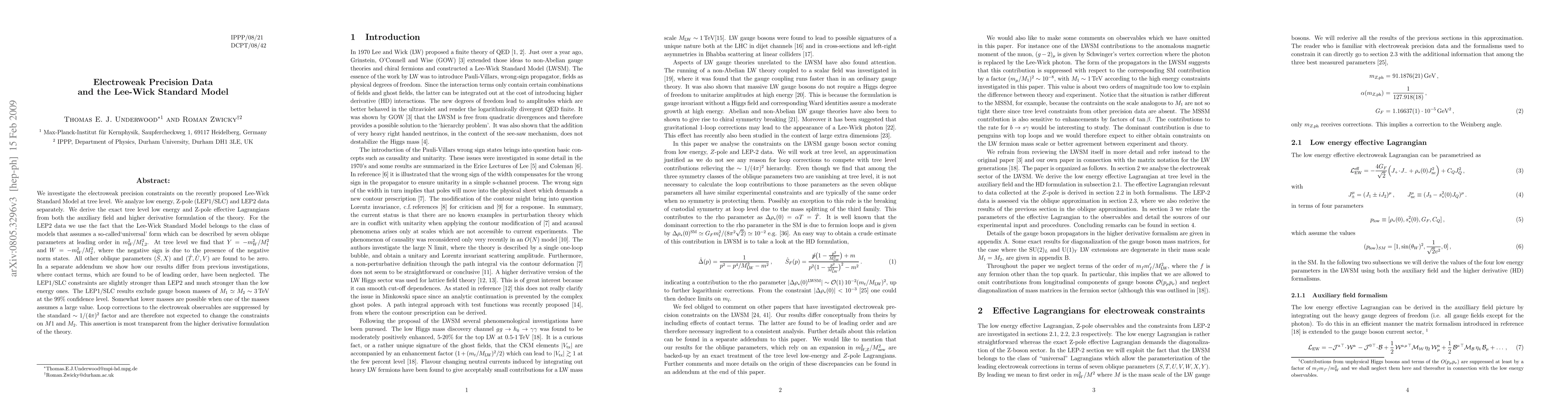 This paper examines electroweak precision constraints on the Lee-Wick Standard Model at tree level, finding that only oblique parameters Y and W are non-zero, with S and T remaining zero. The LEP1/SLC data provides stronger constraints, excluding gauge boson masses of around 3 TeV at 99% confidence.