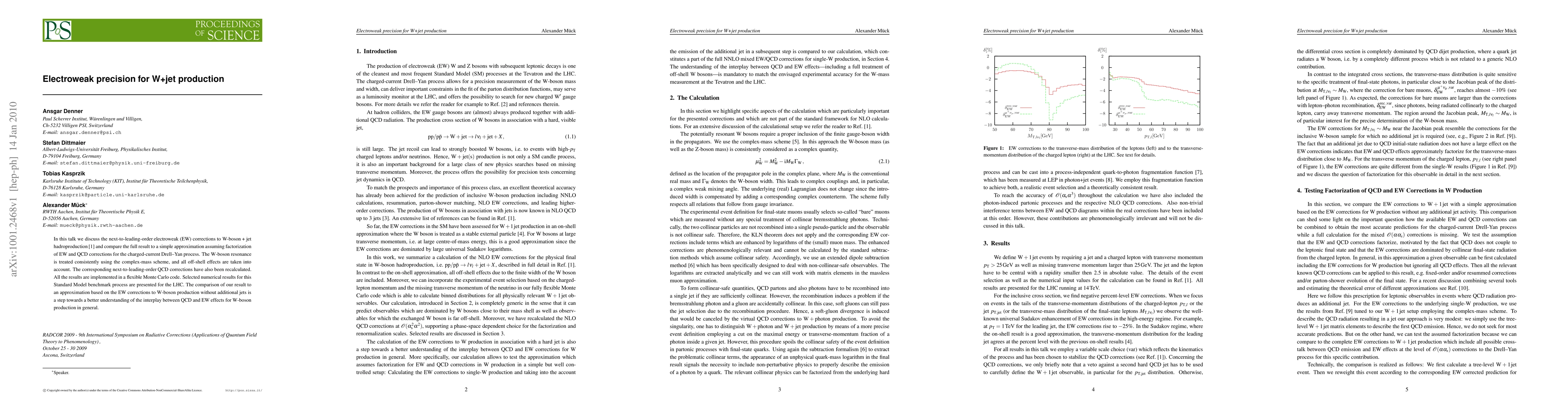 In this talk we discuss the next-to-leading-order electroweak (EW) corrections to W-boson + jet hadroproduction [1] and compare the full result to a simple approximation assuming factorization of EW and QCD corrections for the charged-current Drell-Yan process. The W-boson resonance is treated consistently using the complex-mass scheme, and all off-shell effects are taken into account. The corresponding next-to-leading-order QCD corrections have also been recalculated. All the results are implemented in a flexible Monte Carlo code. Selected numerical results for this Standard Model benchmark process are presented for the LHC. The comparison of our result to an approximation based on the EW corrections to W-boson production without additional jets is a step towards a better understanding of the interplay between QCD and EW effects for W-boson production in general.