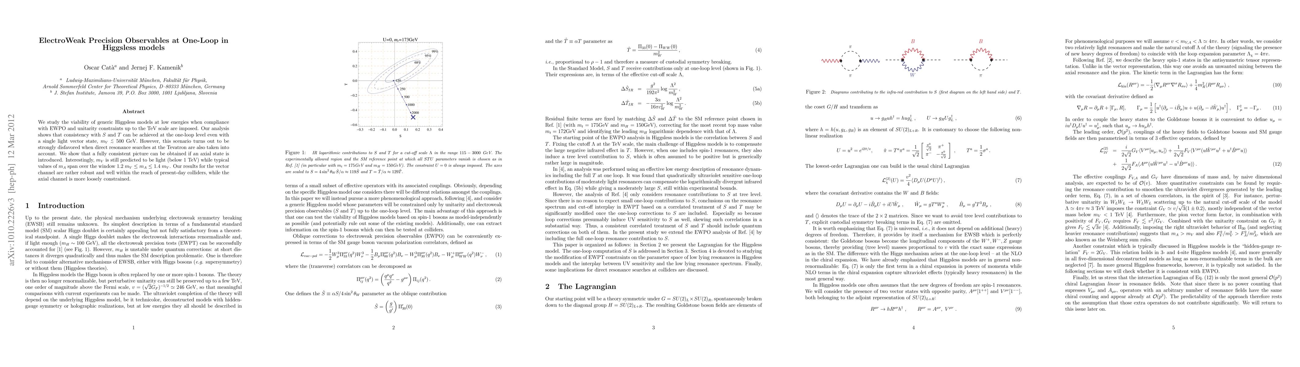 The paper investigates Higgsless models' compatibility with ElectroWeak Precision Observables (EWPO) and unitarity up to TeV scales, finding that a single light vector state (m_V <= 500 GeV) can satisfy S and T constraints at one-loop level. However, direct resonance searches at the Tevatron disfavor this scenario. Introducing an axial state allows for a consistent, lighter-mass (below 1 TeV) vector boson (m_V) and heavier axial resonance (1.2 m_V <= m_A <= 1.4 m_V) picture. The vector channel predictions are collider-reachable, while axial channel constraints are less tight.