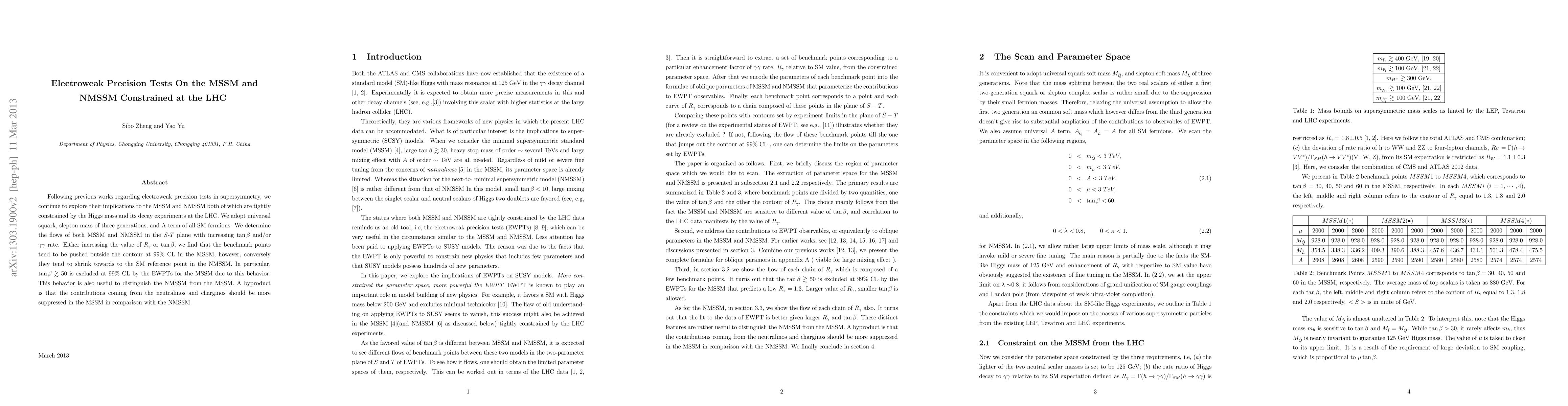 This paper investigates the implications of electroweak precision tests (EWPTs) on the Minimal Supersymmetric Standard Model (MSSM) and Next-to-Minimal Supersymmetric Standard Model (NMSSM), constrained by LHC Higgs data. It finds that while high $\tan\beta$ values push MSSM points outside the 99% CL contour, the NMSSM points tend to converge towards the Standard Model reference, distinguishing the two models.