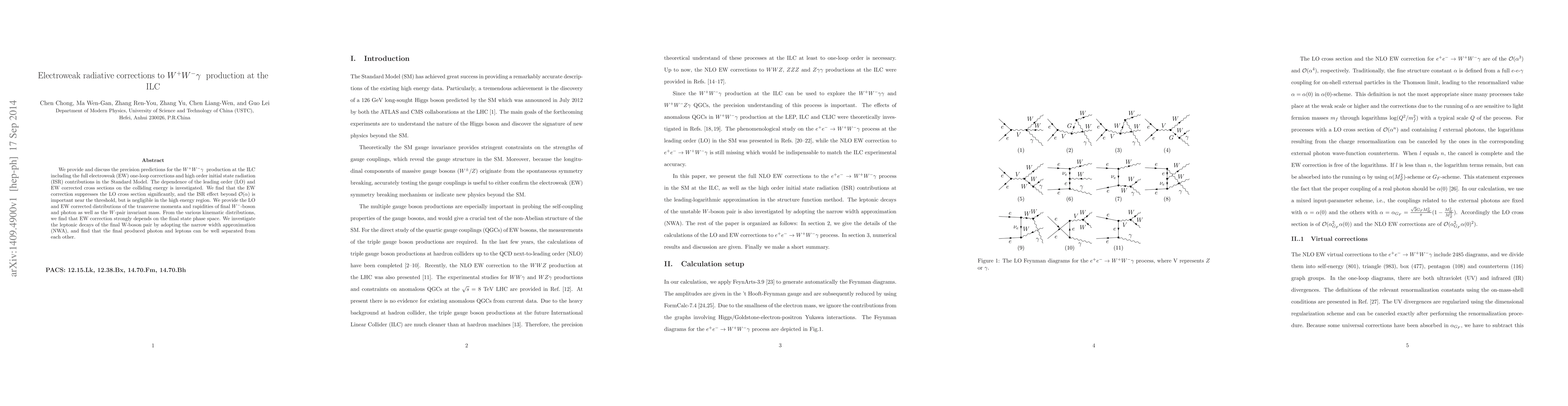 We provide and discuss the precision predictions for the $W^+W^-\gamma$ production at the ILC including the full electroweak (EW) one-loop corrections and high order initial state radiation (ISR) contributions in the Standard Model. The dependence of the leading order (LO) and EW corrected cross sections on the colliding energy is investigated. We find that the EW correction suppresses the LO cross section significantly, and the ISR effect beyond ${\cal O}(\alpha)$ is important near the threshold, but is negligible in the high energy region. We provide the LO and EW corrected distributions of the transverse momenta and rapidities of final $W^-$-boson and photon as well as the $W$-pair invariant mass. From the various kinematic distributions, we find that EW correction strongly depends on the final state phase space. We investigate the leptonic decays of the final W-boson pair by adopting the narrow width approximation (NWA), and find that the final produced photon and leptons can be well separated from each other.