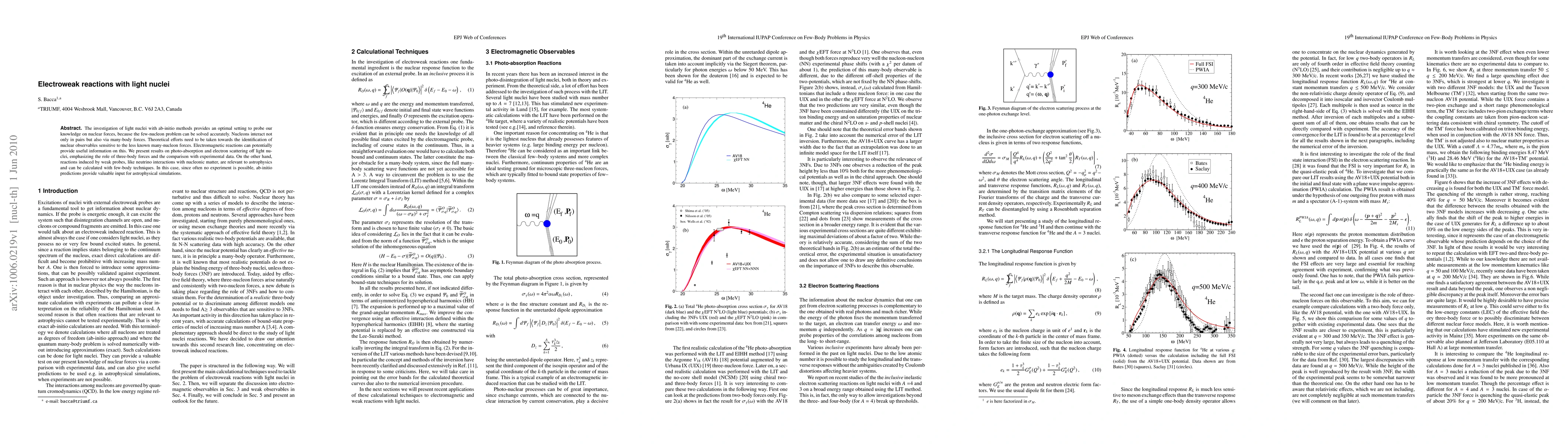 The investigation of light nuclei with ab-initio methods provides an optimal setting to probe our knowledge on nuclear forces, because the few-nucleon problem can be solved accurately. Nucleons interact not only in pairs but also via many-body forces. Theoretical efforts need to be taken towards the identification of nuclear observables sensitive to the less known many-nucleon forces. Electromagnetic reactions can potentially provide useful information on this. We present results on photo-absorption and electron scattering off light nuclei, emphasizing the role of three-body forces and the comparison with experimental data. On the other hand, reactions induced by weak probes, like neutrino interactions with nucleonic matter, are relevant to astrophysics and can be calculated with few-body techniques. In this case, since often no experiment is possible, ab-initio predictions provide valuable input for astrophysical simulations.