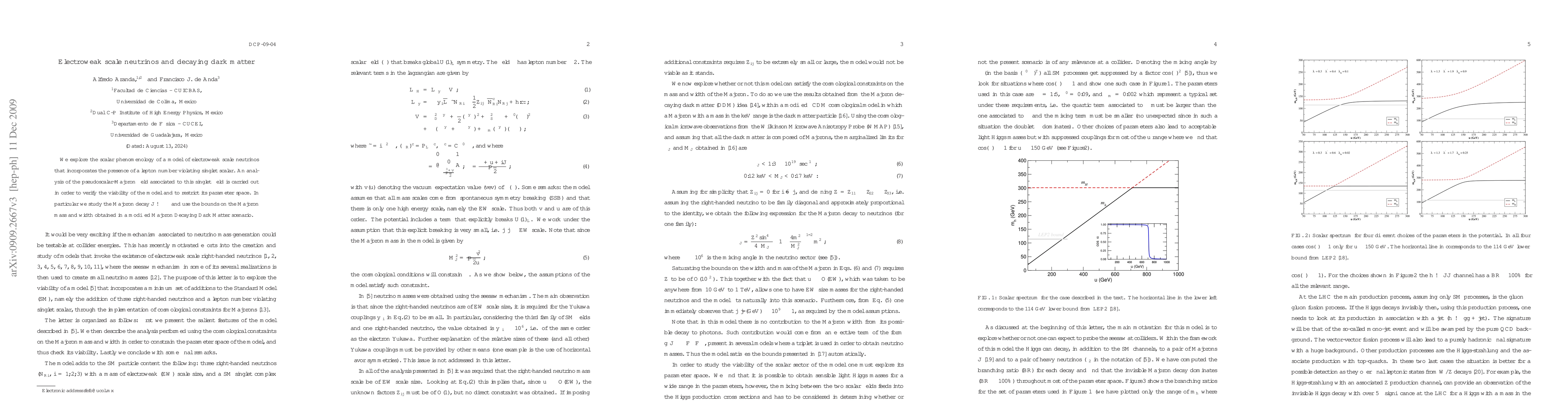 We explore the scalar phenomenology of a model of electroweak scale neutrinos that incorporates the presence of a lepton number violating singlet scalar. An analysis of the pseudoscalar-Majoron field associated to this singlet field is carried out in order to verify the viability of the model and to restrict its parameter space. In particular we study the Majoron decay $J \to \nu \nu$ and use the bounds on the Majoron mass and width obtained in a modified Majoron Decaying Dark Matter scenario.