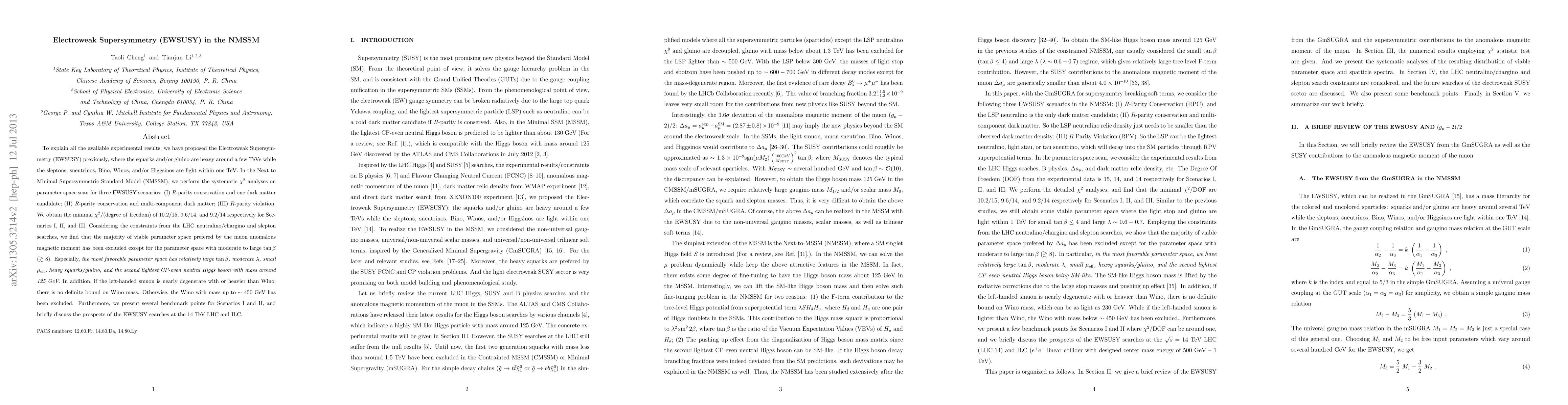 To explain all the available experimental results, we have proposed the Electroweak Supersymmetry (EWSUSY) previously, where the squarks and/or gluino are heavy around a few TeVs while the sleptons, sneutrinos, Bino, Winos, and/or Higgsinos are light within one TeV. In the Next to Minimal Supersymmetric Standard Model (NMSSM), we perform the systematic \chi^2 analyses on parameter space scan for three EWSUSY scenarios: (I) R-parity conservation and one dark matter candidate; (II) R-parity conservation and multi-component dark matter; (III) R-parity violation. We obtain the minimal \chi^2/(degree of freedom) of 10.2/15, 9.6/14, and 9.2/14 respectively for Scenarios I, II, and III. Considering the constraints from the LHC neutralino/chargino and slepton searches, we find that the majority of viable parameter space prefered by the muon anomalous magnetic moment has been excluded except for the parameter space with moderate to large \tan\beta (\ge 8). Especially, the most favorable parameter space has relatively large \tan\beta, moderate \lambda, small \mu_{eff}, heavy squarks/gluino, and the second lightest CP-even neutral Higgs boson with mass around 125 GeV. In addition, if the left-handed smuon is nearly degenerate with or heavier than Wino, there is no definite bound on Wino mass. Otherwise, the Wino with mass up to \sim 450 GeV has been excluded. Furthermore, we present several benchmark points for Scenarios I and II, and briefly discuss the prospects of the EWSUSY searches at the 14 TeV LHC and ILC.