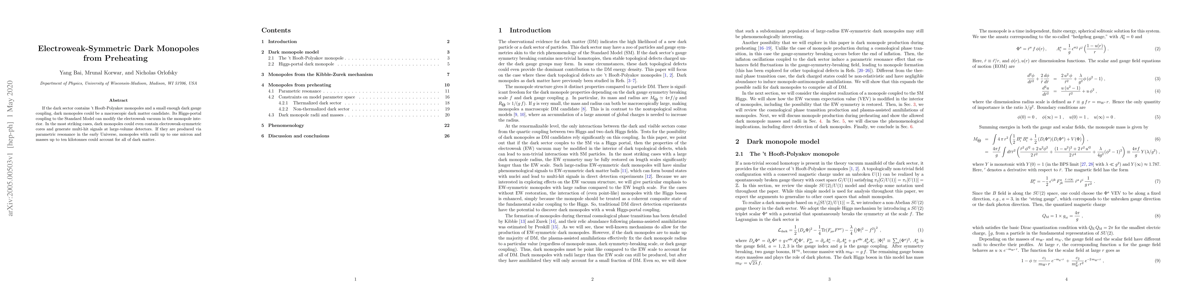 The research introduces the concept of macroscopic dark monopoles with electroweak-symmetric cores produced via parametric resonance, offering a distinct dark matter scenario compared to traditional WIMPs or axions.