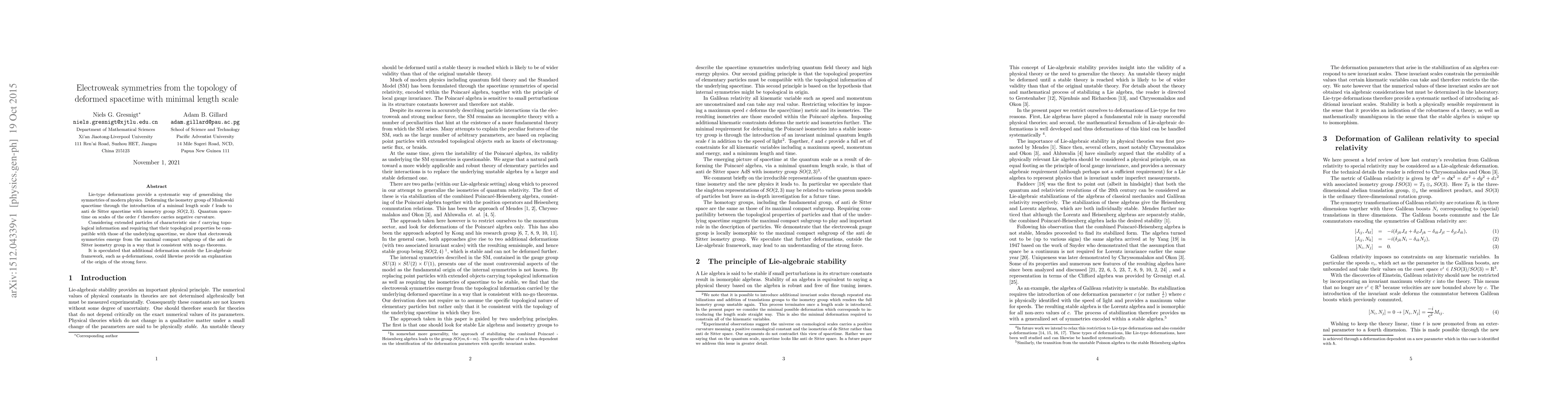 This paper explores how electroweak symmetries arise from the topology of deformed spacetime with a minimal length scale, showing that such deformations lead to anti de Sitter spacetime and negative curvature. It suggests that extended particles carrying topological information can reconcile these symmetries with underlying spacetime properties.