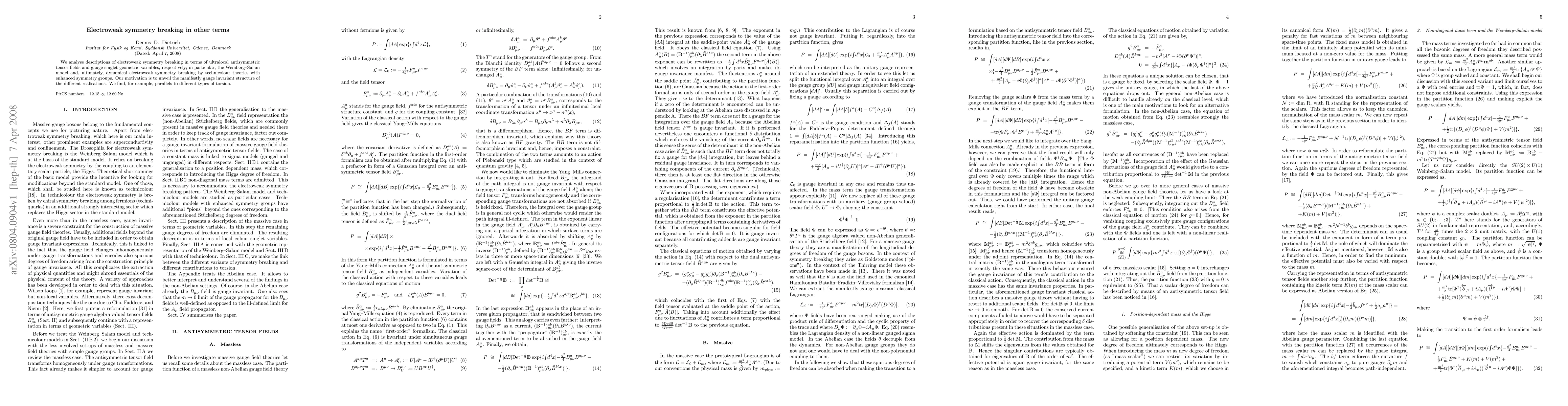 We analyse descriptions of electroweak symmetry breaking in terms of ultralocal antisymmetric tensor fields and gauge-singlet geometric variables, respectively; in particular, the Weinberg--Salam model and, ultimately, dynamical electroweak symmetry breaking by technicolour theories with enhanced symmetry groups. Our motivation is to unveil the manifestly gauge invariant structure of the different realisations. We find, for example, parallels to different types of torsion.